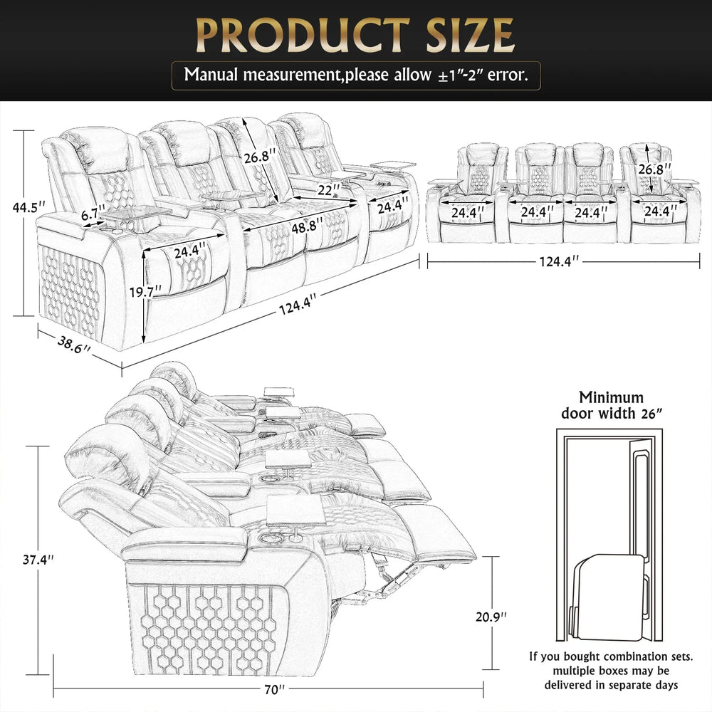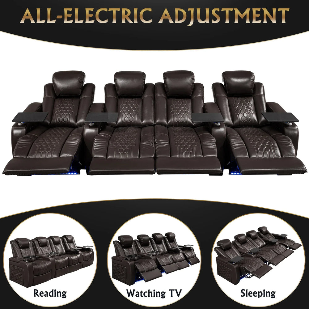 Sink into luxury with this premium genuine leather power recliner designed for ultimate relaxation. Crafted from top-grain Nappa leather and enhanced with Comfort-Matrix Technology, it combines memory foam, cooling gel, springs, and support foam to deliver ergonomic comfort and temperature regulation for hours of enjoyable seating. Fully adjustable lumbar support and headrest ensure you find the perfect position, whether you're watching movies or unwinding after a long day. Stay connected effortlessly with built-in 18W USB-C and USB-A charging ports, while the integrated cup holder keeps your favorite drinks within easy reach. Dynamic RGB LED lighting with 41 vibrant colors enhances your entertainment space and illuminates the cup holder for convenience in low light. With sleek black chrome accents and smooth air-piston-powered arm storage, this recliner combines modern design with smart functionality. Elevate your home theater or living room seating experience today.