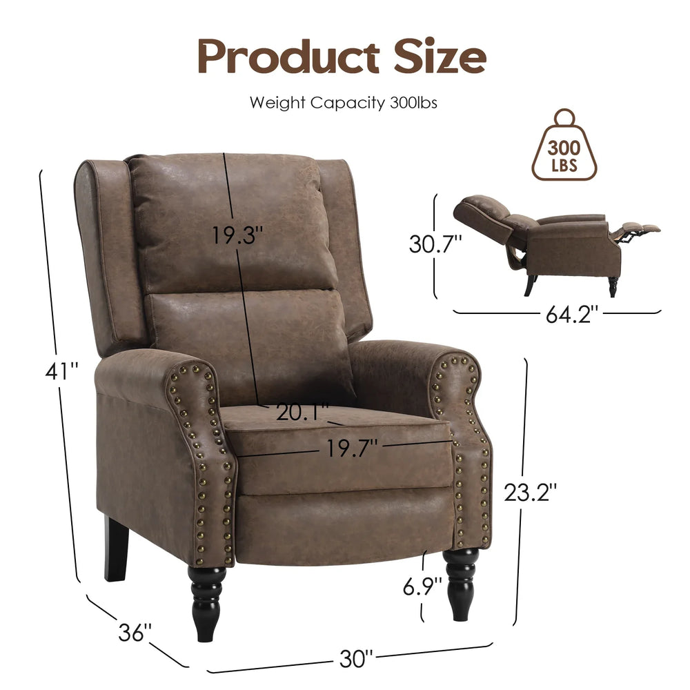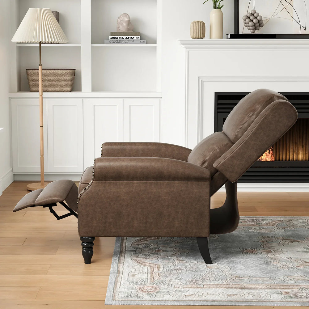 Sink into relaxation with this stylish coffee-colored faux leather pushback recliner chair, designed for ultimate comfort in your living room, bedroom, or RV. The soft yet durable faux leather upholstery feels gentle to the touch and is easy to clean, making maintenance effortless. Its ergonomic design supports your back and lumbar, giving you soothing relief while you watch TV, read, or rest. With a compact footprint of 36 inches deep by 30 inches wide and 41 inches high, this recliner fits perfectly into cozy spaces without sacrificing comfort. Assembly is quick and tool-free, so you can enjoy relaxation in minutes. Elevate your comfort and style today with this versatile recliner built to last.