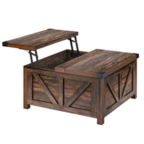 Bring rustic charm and modern functionality to your living room with this farmhouse-style lift top coffee table. Crafted from high-density engineered wood with a warm brown finish, it features a classic square design accented by vintage metal corners, adding a nostalgic touch to any decor—from rustic to industrial. The smooth lift-top mechanism raises the tabletop to 23.6 inches, creating a versatile workspace or dining surface. Inside, a spacious hidden storage compartment keeps blankets, books, games, and essentials organized and dust-free, perfect for maintaining a tidy home. Equipped with multiple charging ports including 2 USB and 1 Type-C, this coffee table lets you power devices effortlessly while you relax. Designed for durability and convenience, it supports up to 140 lbs and assembles easily with included instructions. Upgrade your living area today with this stylish and practical centerpiece.