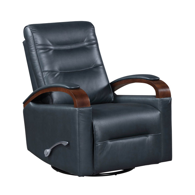 Enhance your living room with this contemporary swivel gliding recliner, upholstered in breathable navy leather for lasting comfort and easy care. Crafted on a solid wood frame with sturdy plywood and metal reinforcements, it provides reliable support for up to 300 pounds. Sink into plush foam padding layered over pocket coils for exceptional cushioning, while the pull-handle reclining mechanism and smooth gliding motion let you effortlessly find your ideal lounging position. The full 360-degree swivel offers flexible movement, making it perfect for relaxing, reading, or entertaining. Solid rubberwood arms in a warm brown finish add an elegant, modern touch that complements any primary living space. Easy to assemble and designed with attached cushions and a removable seat back, this recliner combines style and function to elevate your relaxation today.