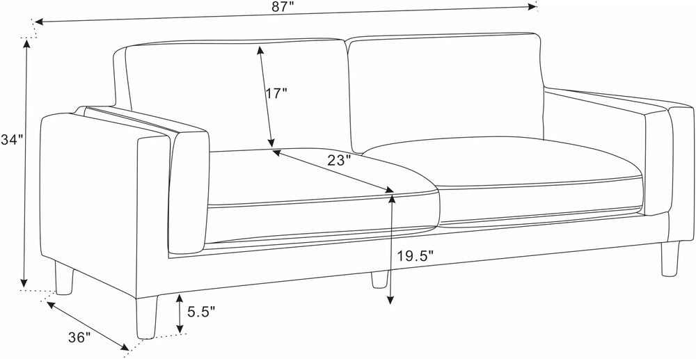 • Dimensions: 87 in. length x 36 in. width x 34 in. height (221 x 91 x 86 cm).