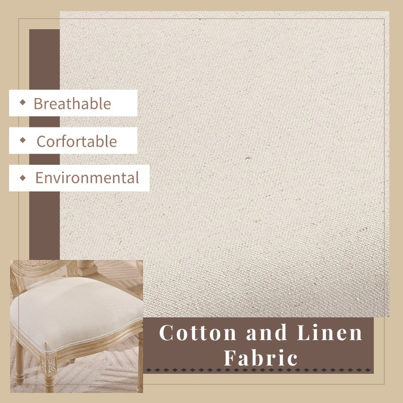 Bring timeless elegance and comfort to your dining space with this set of two French Country dining chairs. Featuring a natural rattan round backrest that provides sturdy support with breathable texture, these chairs blend classic charm with modern craftsmanship. The high-quality cotton and linen upholstery offers a soft, skin-friendly seat covering, perfect for long meals and gatherings. Expertly carved solid wood frames and wire drawing techniques add refined detail and a vintage touch, making these chairs a standout in any living room, kitchen, or restaurant. Designed for easy disassembly, they save space when not in use and are simple to assemble with included tools. At just 24.5 pounds each and sized for versatile placement, these beige chairs provide lasting durability and style. Elevate your home or business ambiance today with this exquisite dining set.