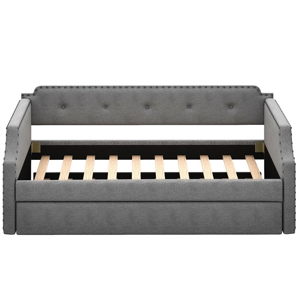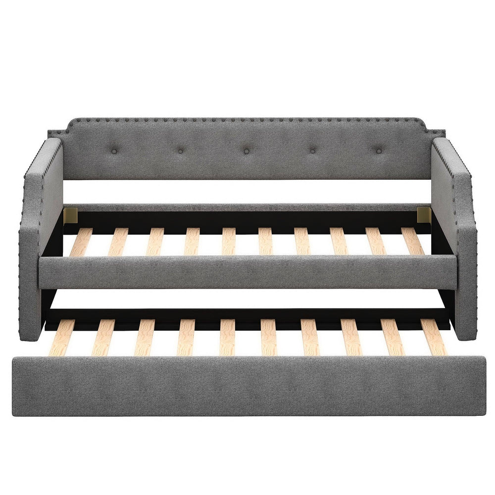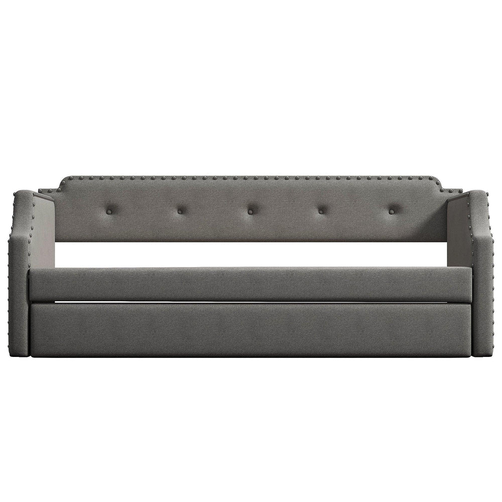 Perfect for small living rooms, guest bedrooms, or dorms, this gray upholstered daybed with trundle offers versatile comfort and classic design. Crafted with a sturdy wood slat support frame and wrapped in durable linen fabric, it provides both cozy seating and restful sleeping options. The elegant linen upholstery in a neutral gray tone complements any décor style, while the built-in trundle easily pulls out to accommodate guests overnight. Supporting twin-sized mattresses on both the daybed and trundle, this multi-functional sofa bed creates extra space without sacrificing style. With reinforced construction to hold up to 220 lbs on the daybed and 200 lbs on the trundle, it seamlessly transitions from comfortable sofa to convenient guest bed. Easy to assemble and designed for lasting comfort, this piece is an ideal solution to optimize your space. Elevate your living area with this timeless and functional daybed today.