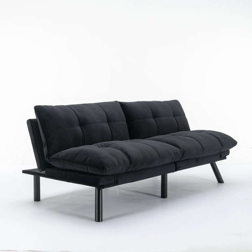 Black convertible folding modern sofa bed features upholstered foam cushioning with a warm, soft cover, adjustable armrest and backrest angles, and supports up to 800 lbs. Ideal for small apartments or primary living spaces, it combines comfort and space-saving design.