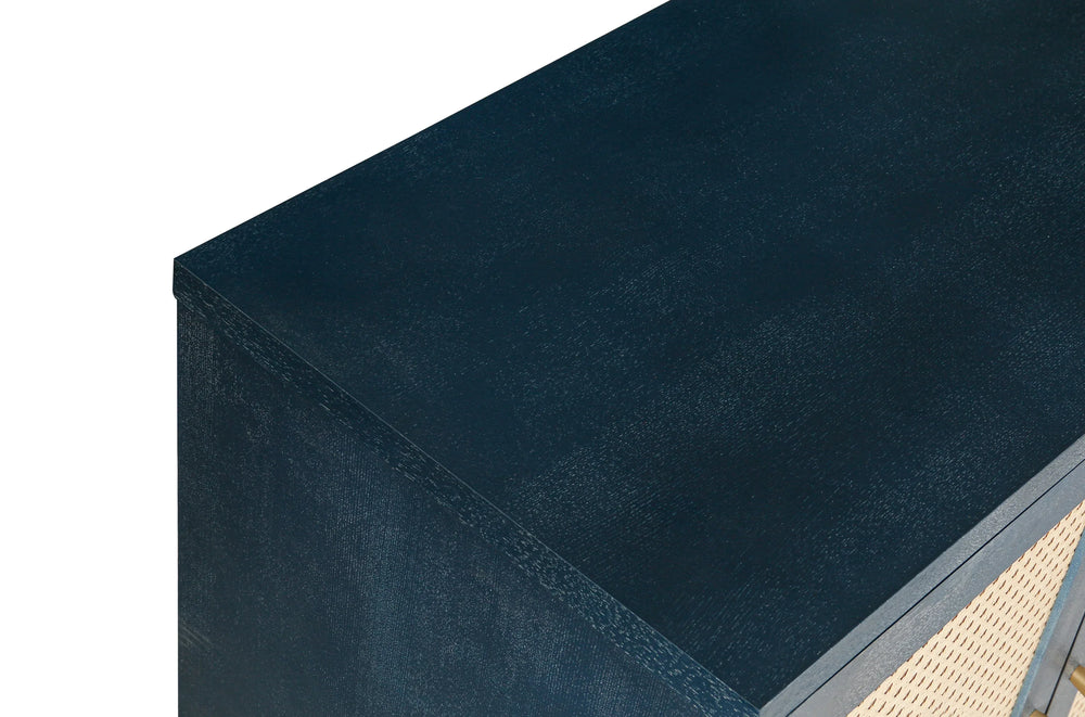Omega Lifestyles rattan sideboard cabinet features handcrafted panels and adjustable shelves, offering sturdy storage with a wide desktop for books and decor. Its antique navy blue MDF construction blends style and function, ideal for living room organization.