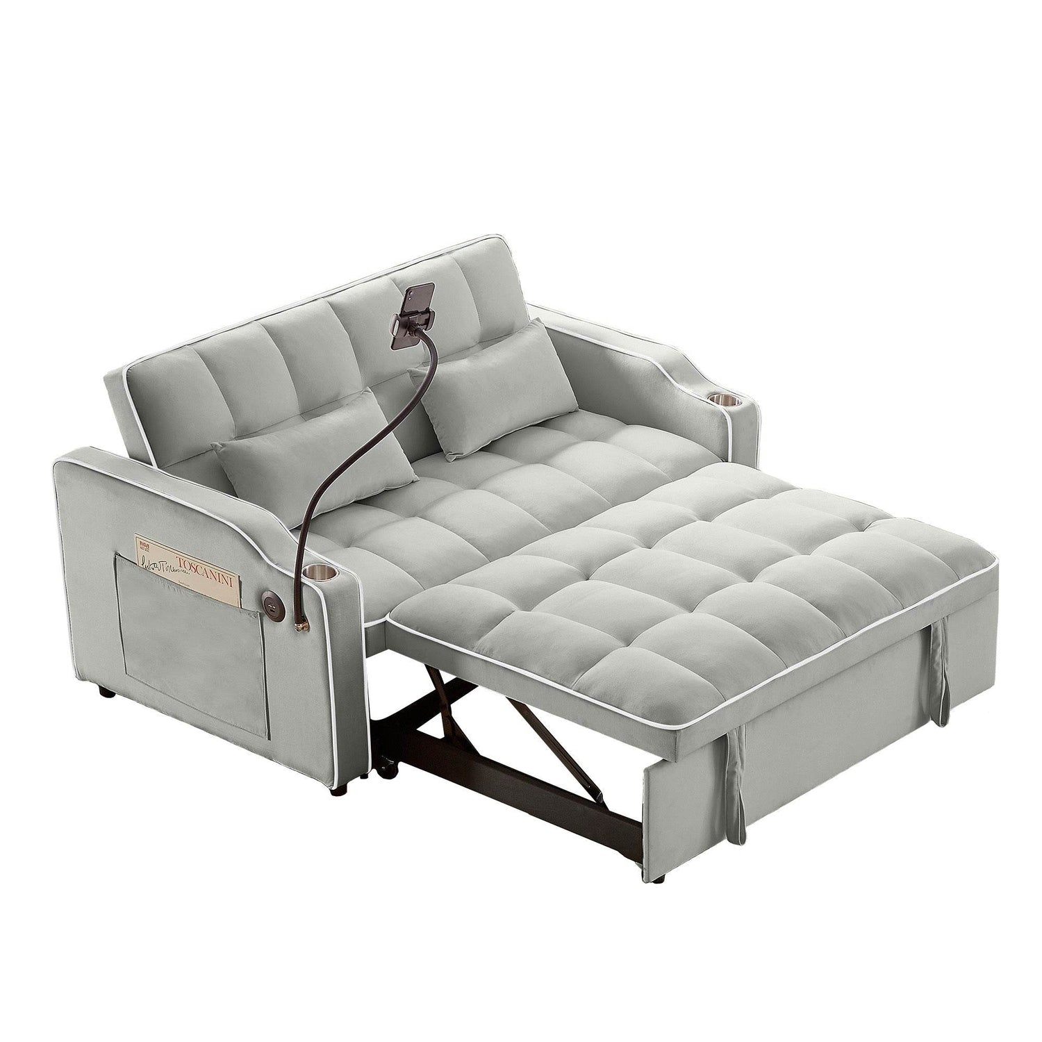 Designed for modern living, this foldable double seat recliner effortlessly converts from a cozy loveseat to a chaise lounge or a full sleeper bed, making it perfect for apartments, studios, and home offices. Upholstered in supple gray velvet and filled with high-density foam, it ensures plush comfort whether you're sitting, reclining, or sleeping. The 3-level adjustable backrest allows personalized positioning from upright sitting to fully flat for restful naps or accommodating overnight guests. Integrated USB and Type-C charging ports keep your devices powered, while the 360° swivel phone stand, cup holders, and side pockets provide convenient storage and hands-free entertainment. Crafted with a sturdy wood and metal frame, this multifunctional recliner combines style, comfort, and practical features to enhance your living space. Elevate your relaxation today with this space-saving, multifunctional sofa bed.