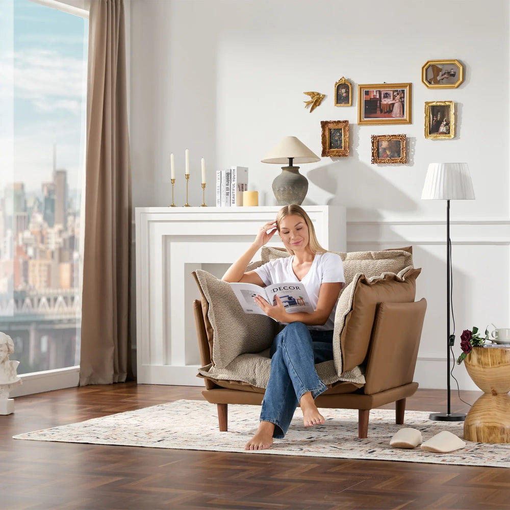 Modern-style oversized chenille armchair with plush fiber foam and polyester padding offers adjustable support and dual fabric options for year-round comfort. Ideal for living rooms, bedrooms, and studies, designed to accommodate multiple seating postures with durable wood and fabric construction.