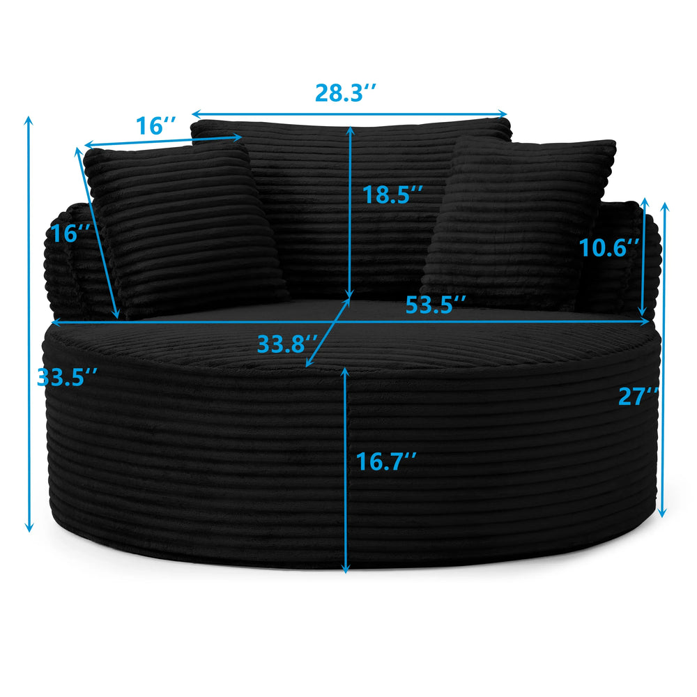 Modern round lounge chair with soft corduroy upholstery and high-density foam cushion offers medium-soft comfort and lumbar support via three pillow backs. Ideal for living rooms, bedrooms, or offices, it requires no assembly and enhances relaxation in primary living spaces.