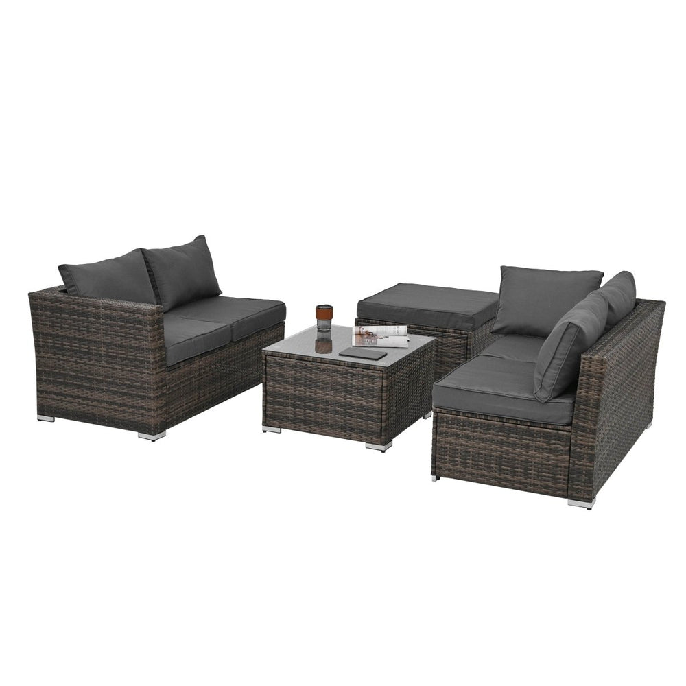 The frame is made of square metal tube, with PE wicker rattan, Hand woven. the cushion stuffing is polyester fiber, it can support long time crash. The table top is 5mm Tempered Glass. Specifications: Color: Dark Grey Material: Tempered Glass, PE Wicher, Metal Tube, Plastic End Cap. Product Dimensions: Two Seats Sofa: 51.50'L x 27.5'W x 25.6H' Ottoman: 27.5'L x 27.5'W x 13.5H' Table: 25.62'L x 25.62'W x 15.75H' Weight: 105.16 LB Package Included: 1 x Patio Four Set Furniture Set