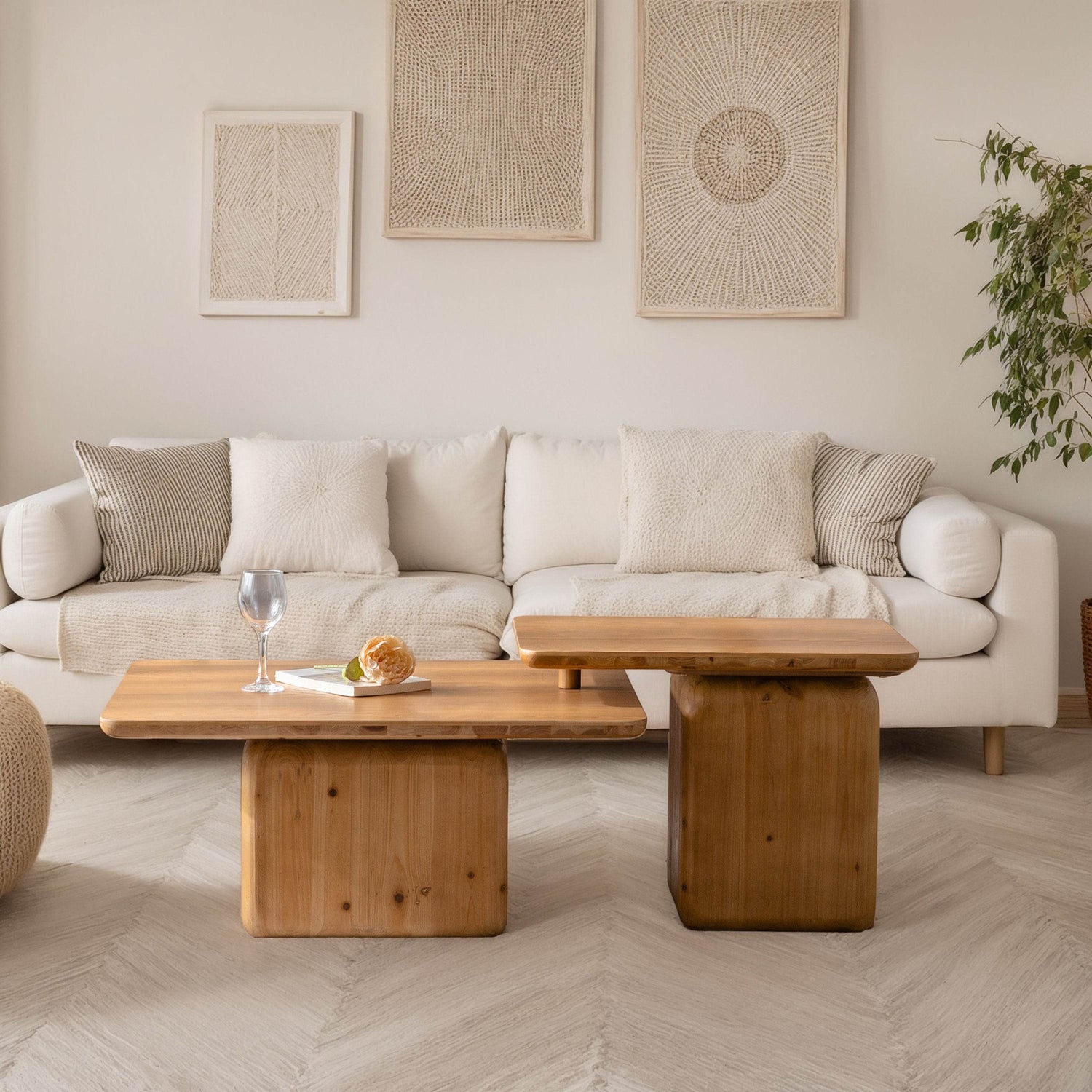 Bring a timeless blend of classic charm and modern functionality to your living room, office, or dining area with this vintage-style coffee table set. Featuring a natural wood grain finish and square design, these two tables serve as elegant statement pieces that complement a variety of interior styles. Crafted with durable MDF veneer tops and sturdy fir wood legs, the set offers reliable strength and resistance to everyday wear. The two different sizes nest or stand alone, providing versatile options for serving drinks, displaying decor, or organizing essentials. Their compact, space-saving design makes them an excellent fit for both small apartments and spacious homes. Easy to assemble and maintain, this coffee table set effortlessly enhances your space with vintage flair and practical utility. Elevate your relaxation and style today.