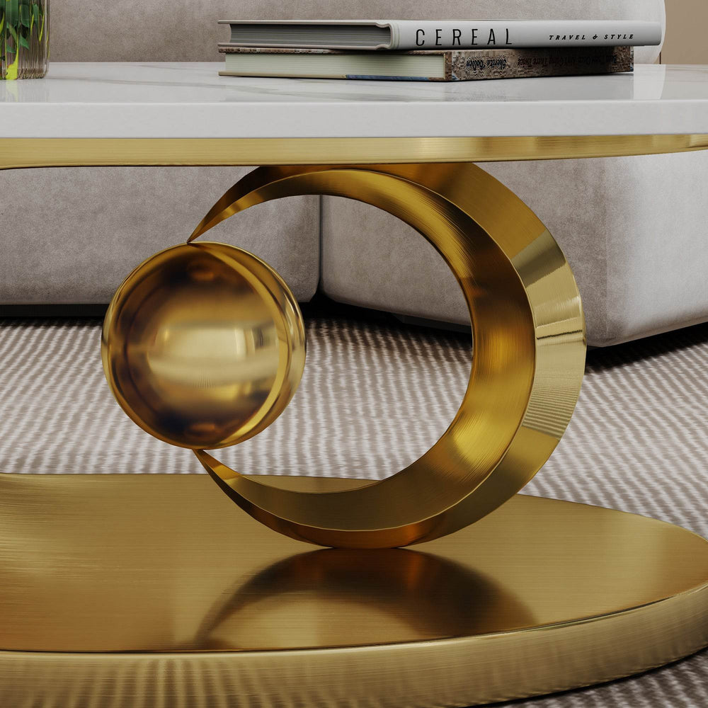 This striking coffee table blends contemporary design with industrial luxury, featuring a fish belly white faux marble top that showcases unique, high-contrast veining for a sophisticated focal point. The durable sintered stone filler adds scratch- and heat-resistance, ensuring everyday elegance that lasts. Its sculptural stainless steel base defies traditional forms with fluid, angular geometry, creating an artistic statement piece that suits modern and minimalist interiors alike. Equipped with micro-adjustable leveling feet, this oval coffee table stays perfectly balanced even on uneven floors, combining style with stability. Ideal for your primary living area, it offers open storage for easy access to essentials while maintaining an uncluttered look. Upgrade your home décor with this timeless coffee table design that marries function and art effortlessly.