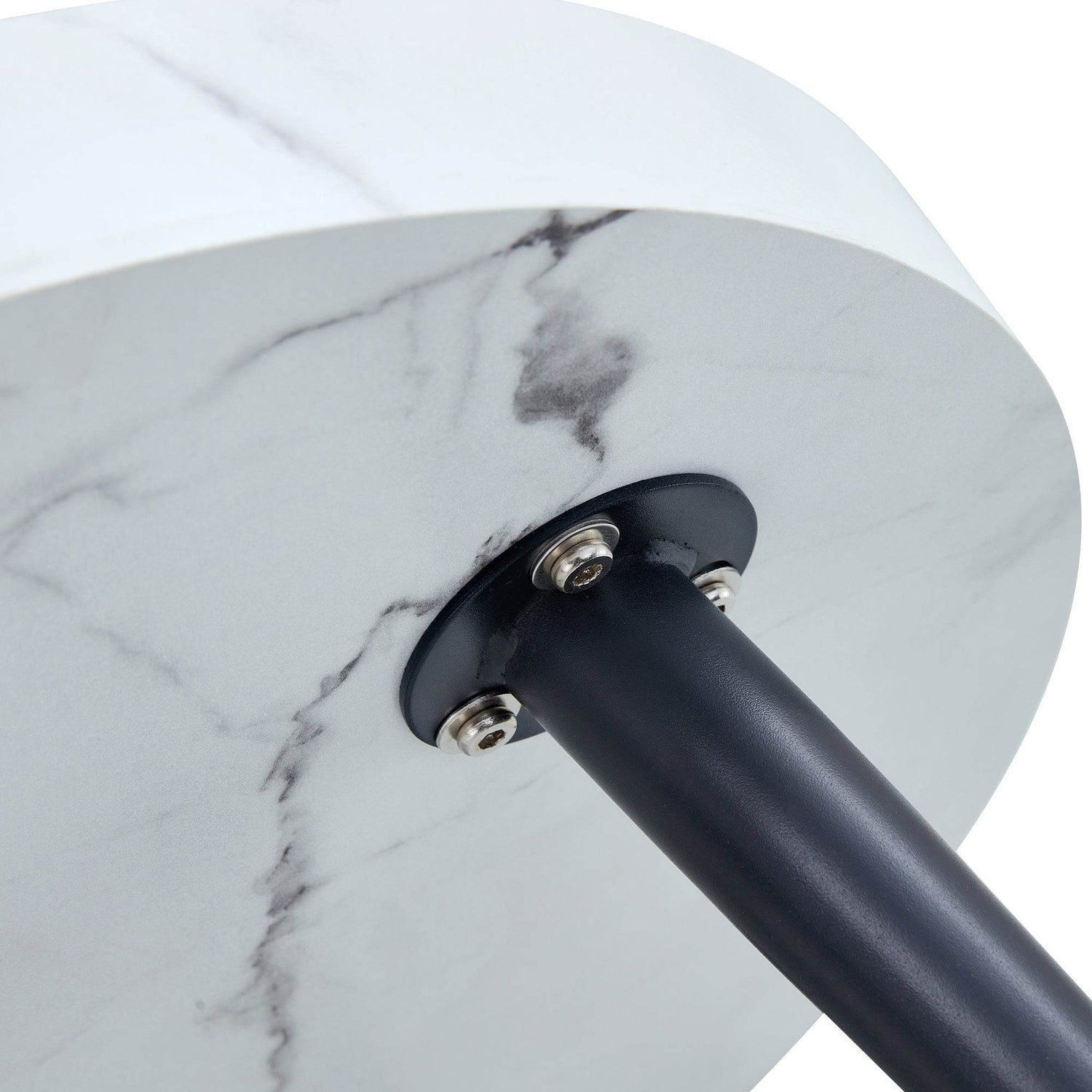 Round coffee table features an elegant white marble pattern tabletop with durable 2-inch MDF construction and a sturdy black sprayed metal stand. Treated with suction molding for water resistance, it includes adjustable feet for level stability and suits modern home decor.