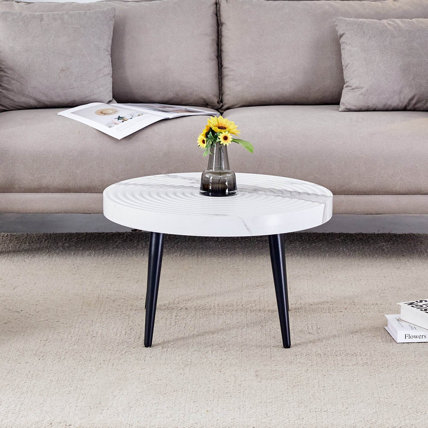 Bring a touch of sophistication to your home with this stunning round coffee table featuring a beautiful white marble pattern tabletop. Crafted from durable 2-inch thick MDF and enhanced with an exquisite suction molding process, the surface is water-resistant and easy to clean, ensuring long-lasting elegance. The striking black sprayed metal legs provide sturdy support and a contemporary contrast to the marble design. At 23.6 inches in diameter and 14.5 inches tall, this compact coffee table fits perfectly in any living room, creating a stylish centerpiece that blends function and modern appeal. Adjustable feet allow for stability on uneven floors, making this table as practical as it is attractive. Upgrade your home décor and enjoy timeless style and reliable performance all in one. Elevate your relaxation today.