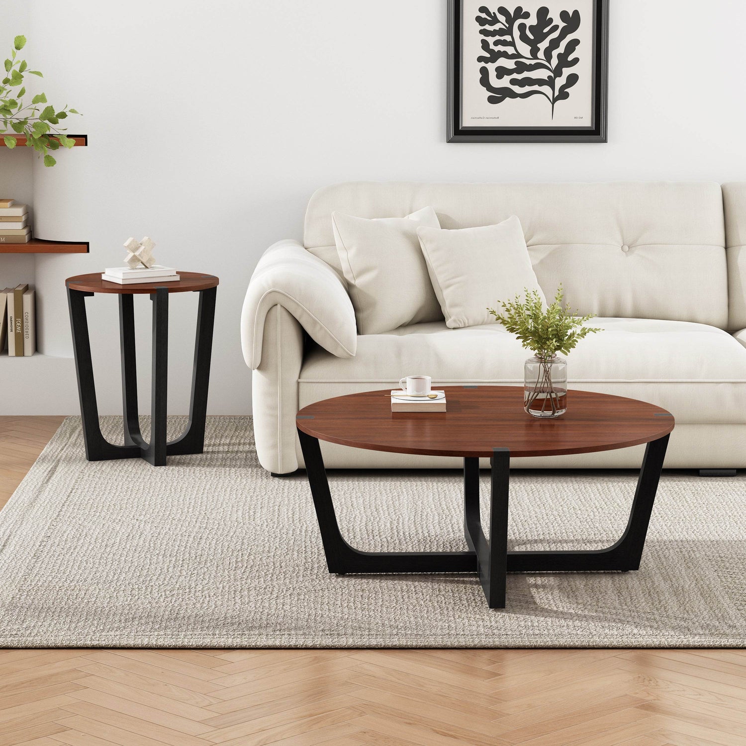 Acacia solid wood coffee table features a 44.2-inch circular top with durable MDF core, offering moisture and scratch resistance. Its stylish brown and black design suits indoor or outdoor living spaces, providing a spacious, sturdy surface for versatile use and easy assembly.