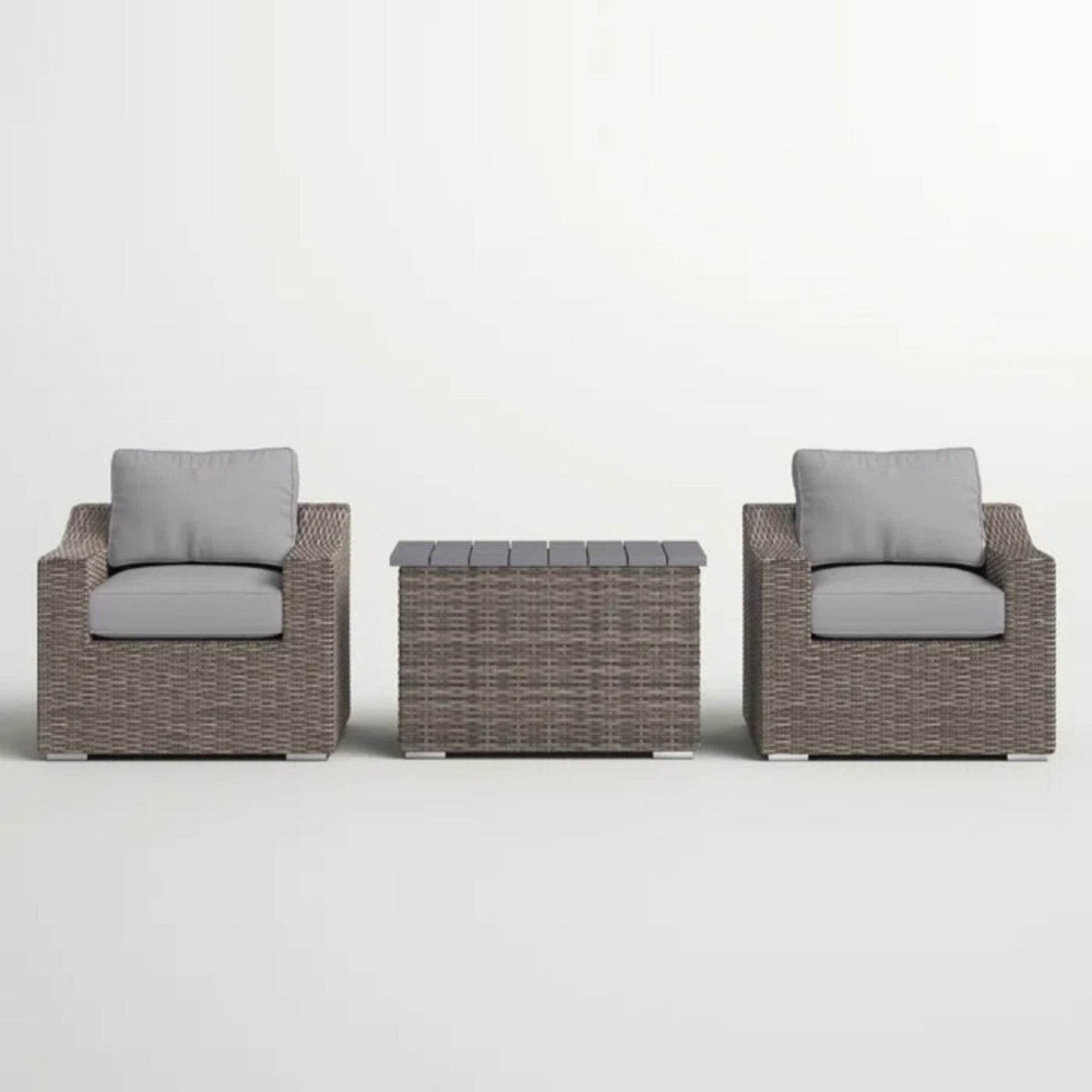 Elevate your outdoor living space with this fully assembled 3-piece rattan wicker seating group, designed for durability and relaxation. Featuring two spacious armchairs with supportive square backs and plush foam cushions covered in water- and UV-resistant olefin fabric, this set invites you to enjoy conversations and leisure time poolside or in your backyard. The sturdy aluminum frames wrapped in all-weather resin wicker provide lasting strength and an elegant grey mix finish that complements any outdoor decor. A versatile storage coffee table completes the set, adding both function and style. Easy to maintain with removable cushion covers and no assembly required, this conversation group enhances your outdoor experience effortlessly. Create your perfect retreat and unwind in cozy comfort today.