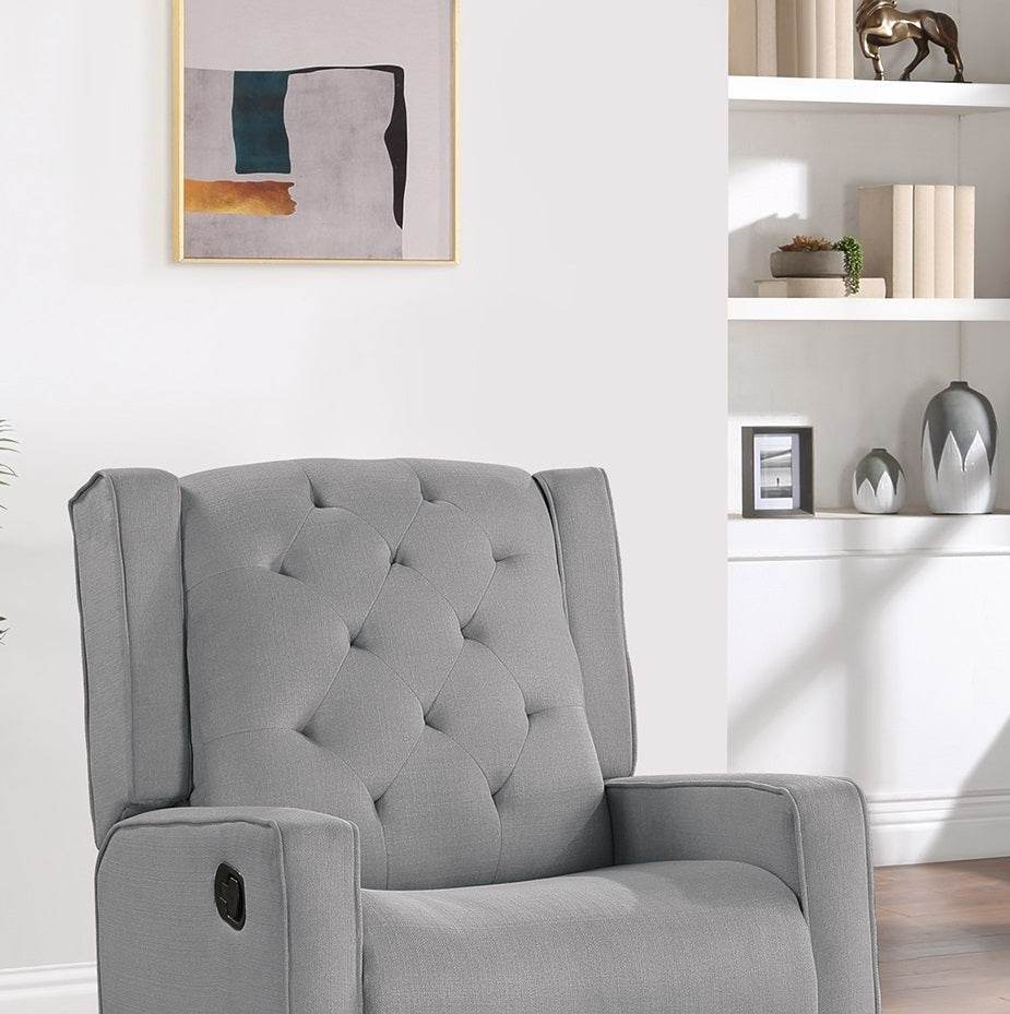Upgrade your living space with this modern swivel recliner chair designed for ultimate comfort and style. Upholstered in durable dark gray polyester, it features a plush foam cushion and a tufted back that provides excellent support for long-lasting relaxation. The manual handle allows smooth reclining motion, while the swivel glider base offers effortless 360-degree rotation and gentle rocking. Crafted with a solid wood frame, this wing-back chair adds a sophisticated touch to any contemporary, modern, or transitional room. Its compact dimensions — 29 inches long, 35 inches wide, and 40 inches high — make it perfect for primary living spaces without overwhelming the room. Whether you're reading, watching TV, or unwinding, this chair creates a cozy retreat. Elevate your comfort and style today.