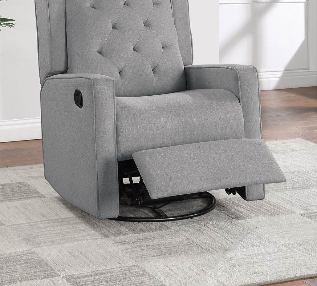 Contemporary dark gray swivel recliner chair features plush foam cushioning, a tufted back, and wingback design for comfort and style. Manual handle recliner with a gliding swivel base, ideal for relaxing in living rooms and primary living spaces.