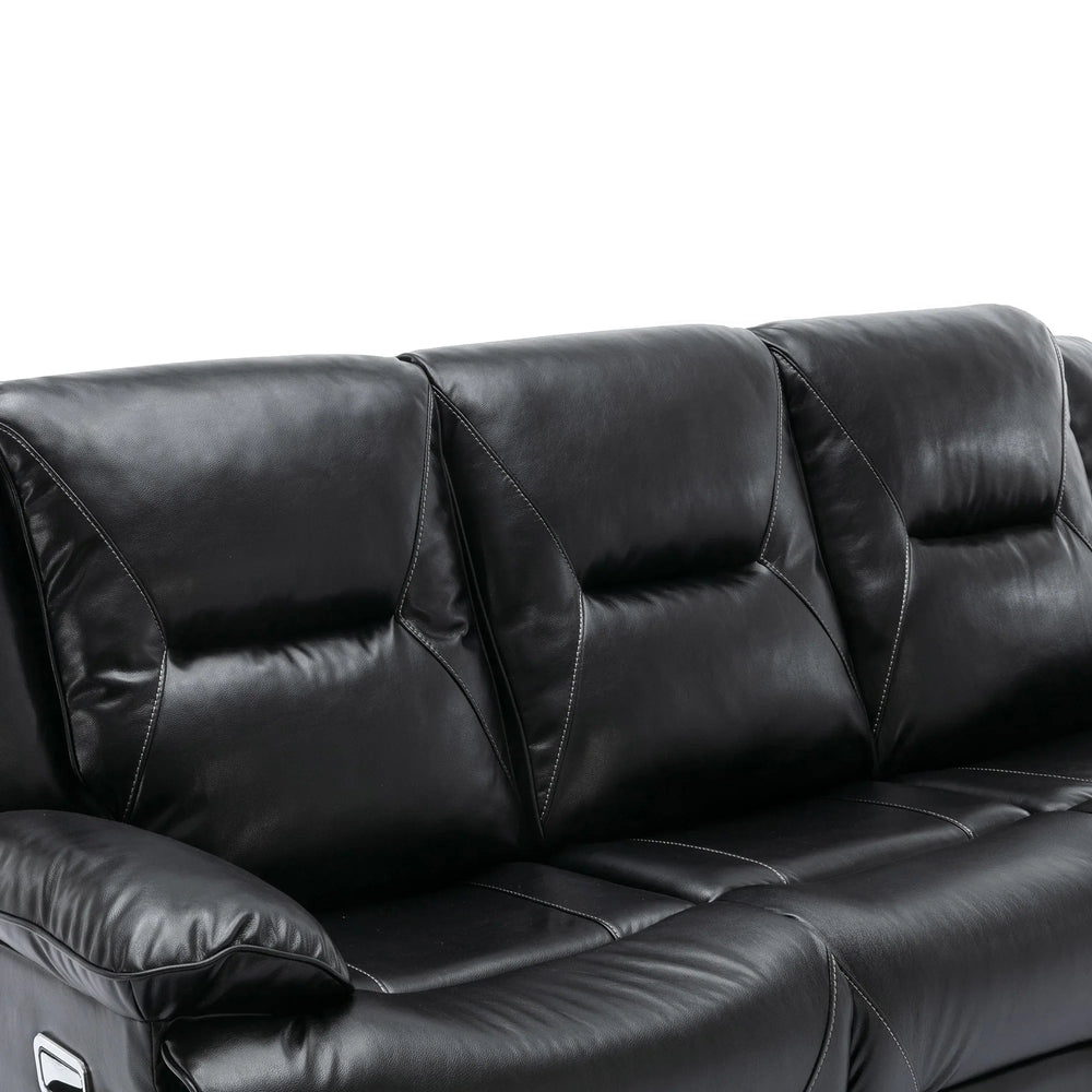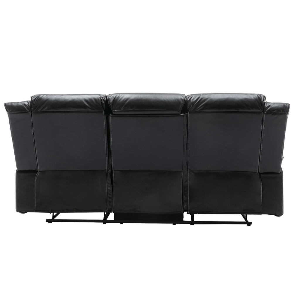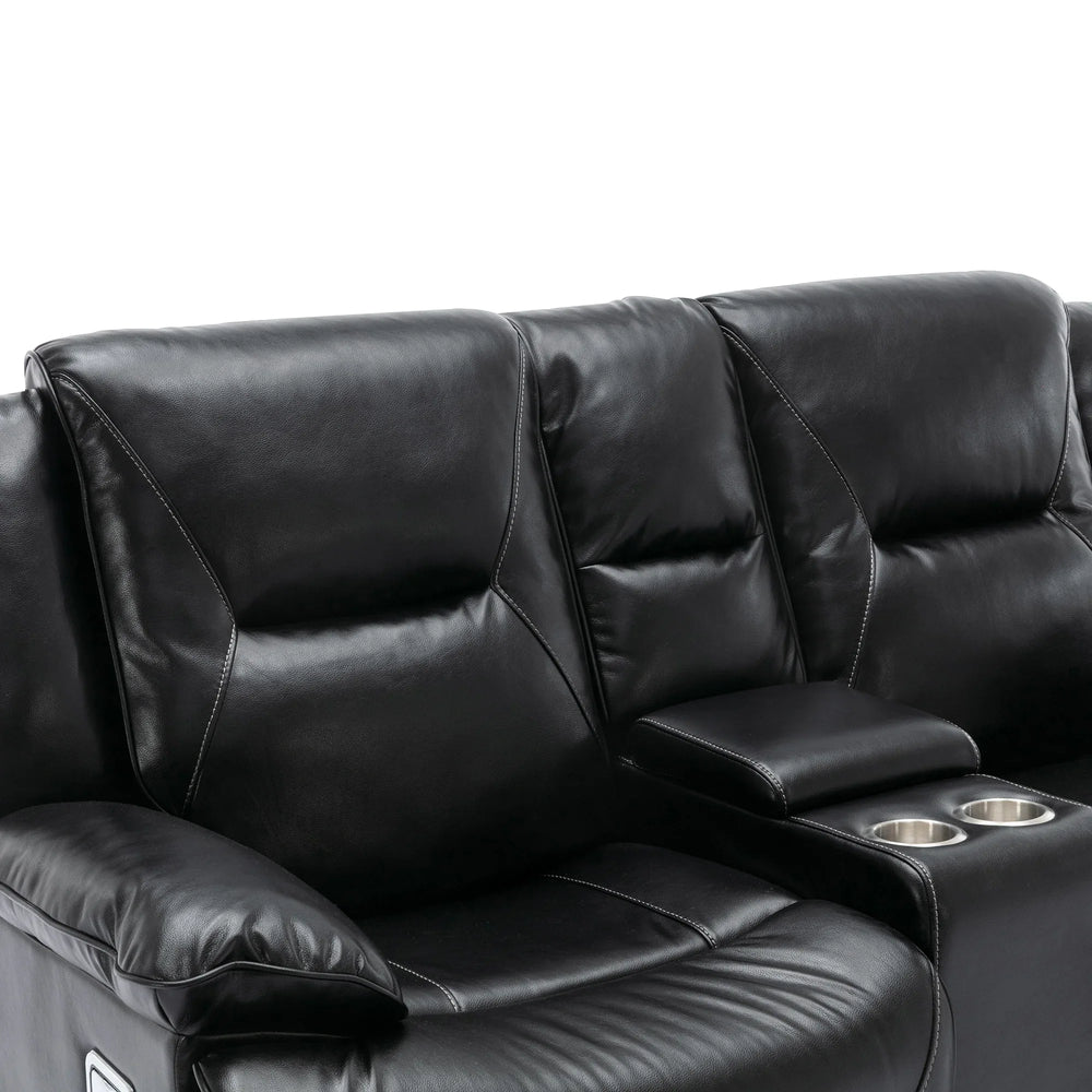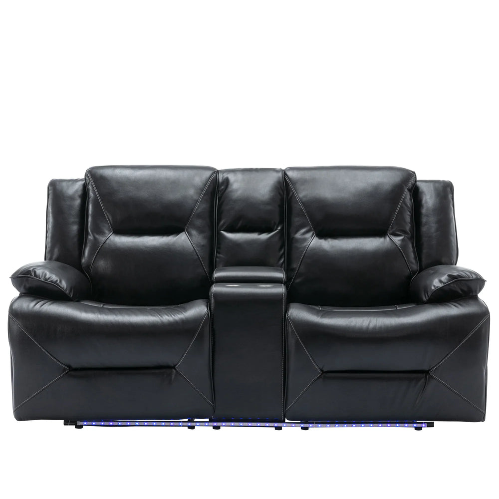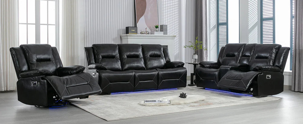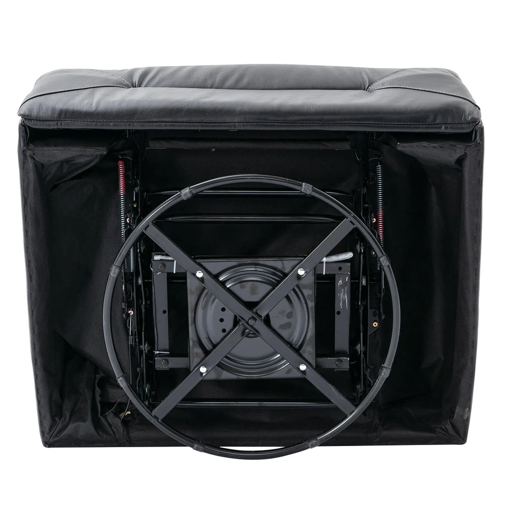 Enjoy the perfect blend of relaxation and style with this black leather gel recliner chair, designed to enhance your home theater experience. Featuring smooth manual reclining from 110° to 150°, it allows you to find your ideal seating angle effortlessly. The plush, overstuffed cushions and wider armrests provide superior comfort and support, while the durable PU upholstery offers waterproof protection and easy cleaning. Equipped with a 360-degree swivel and gentle rocking motion, this recliner helps you unwind completely. Integrated LED light strips create a subtle cinematic ambiance and improve safety in low light. With built-in cup holders and storage compartments, you can keep your favorite beverages and essentials within reach. Whether watching movies, gaming, or reading, this recliner delivers lasting comfort and convenience. Elevate your relaxation today.