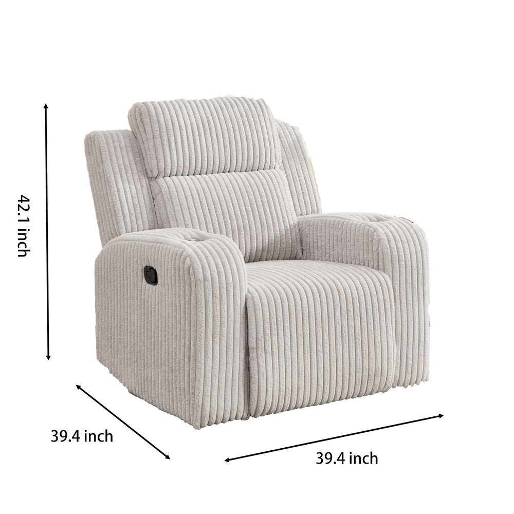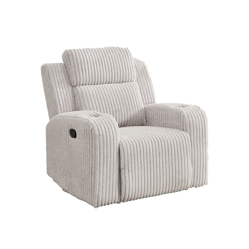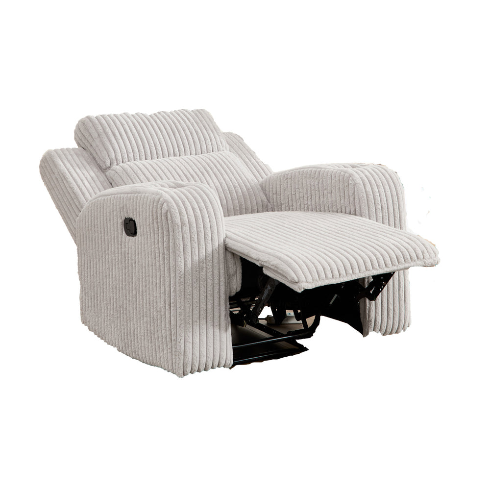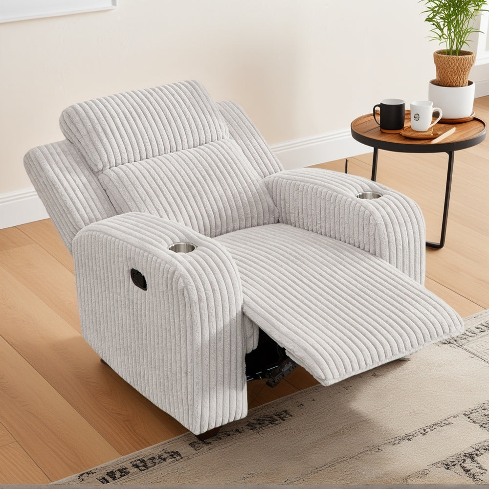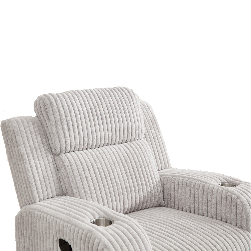 Experience personalized comfort and timeless style with this 1-seater manual recliner sofa, upholstered in soft, breathable grey corduroy. The hollow fiber cushion design enhances airflow, keeping you cool and cozy during long relaxation sessions. Its ergonomic reclining mechanism allows you to effortlessly lean back and unwind, making it perfect for your living room or home theater setup. Integrated cup holders keep your favorite drinks within reach, while the compact dimensions fit seamlessly into smaller spaces without sacrificing comfort. Durable and plush, this recliner sofa invites you to sink into cloud-like cushioning that rebounds quickly to support your body. Elevate your relaxation today with a sofa that combines functionality, comfort, and modern design.