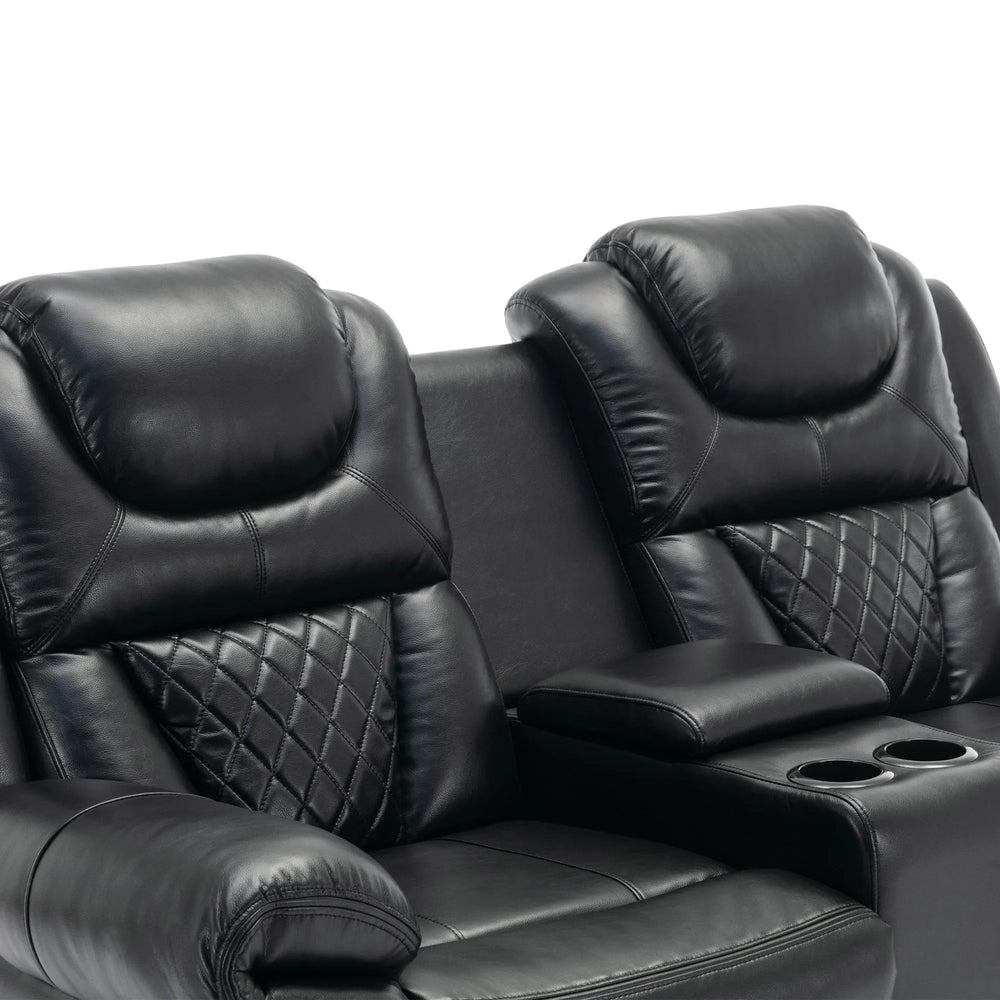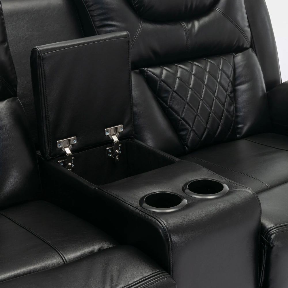 Upgrade your home theater with this stylish black faux leather manual recliner loveseat, crafted for maximum comfort and convenience. Sink into soft, high-density foam cushioning combined with breathable faux leather that keeps you cool even during long movie or gaming sessions. Effortlessly adjust the backrest and footrest to your preferred seating angle, enjoying infinite reclining positions between 110° and 150°. Thoughtfully designed with hidden storage compartments and dual cup holders, this loveseat keeps your essentials and drinks close at hand. The integrated LED light strip adds an inviting ambiance, enhancing your cinematic experience. Built on a sturdy iron and plywood frame with a durable metal footrest, this recliner promises both longevity and reliable support. Spacious yet compact at 73.2 inches (186 cm) long and 39.8 inches (101 cm) wide, it perfectly fits your entertainment space. Elevate your relaxation today with this premium home theater seating.