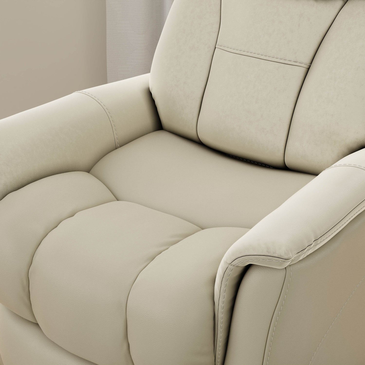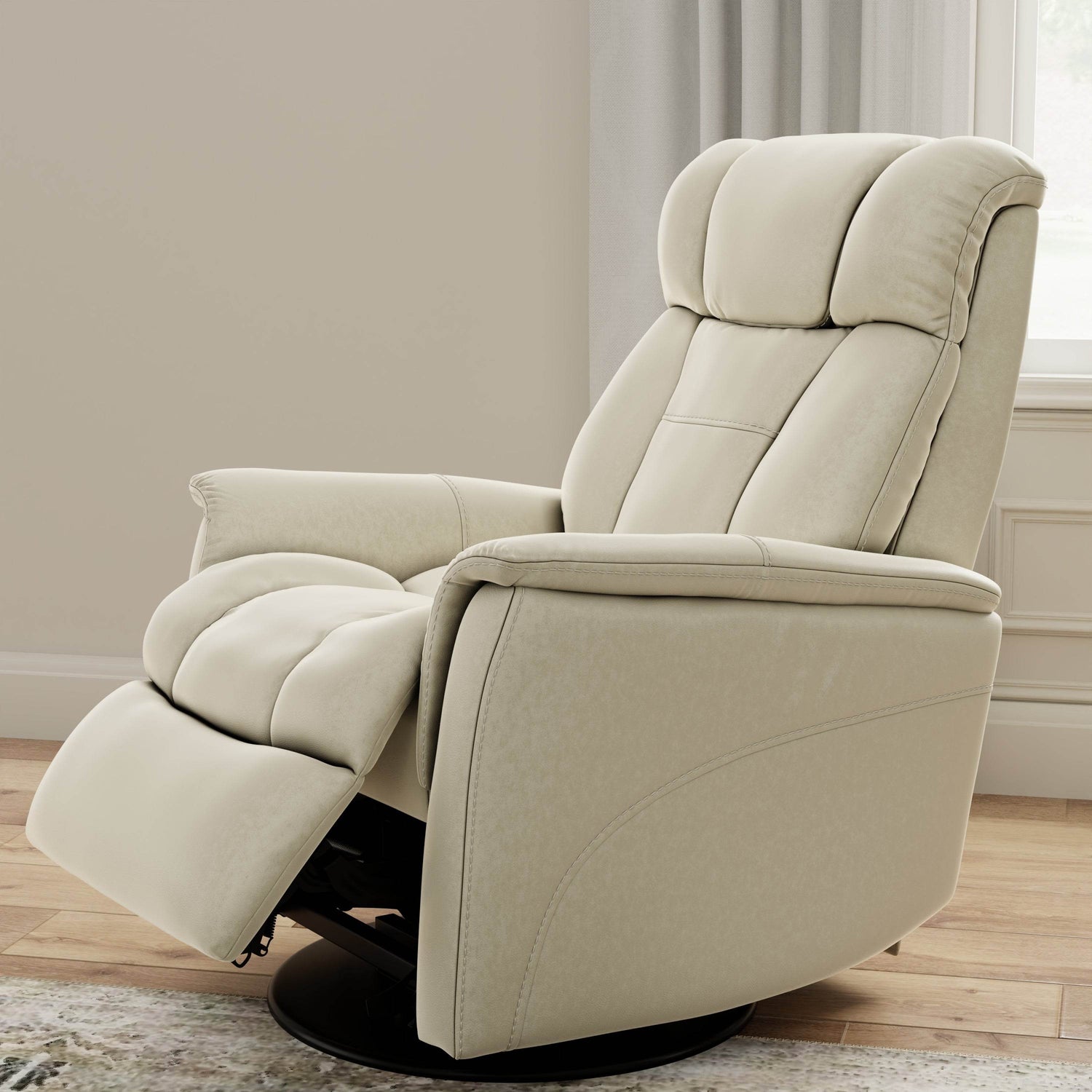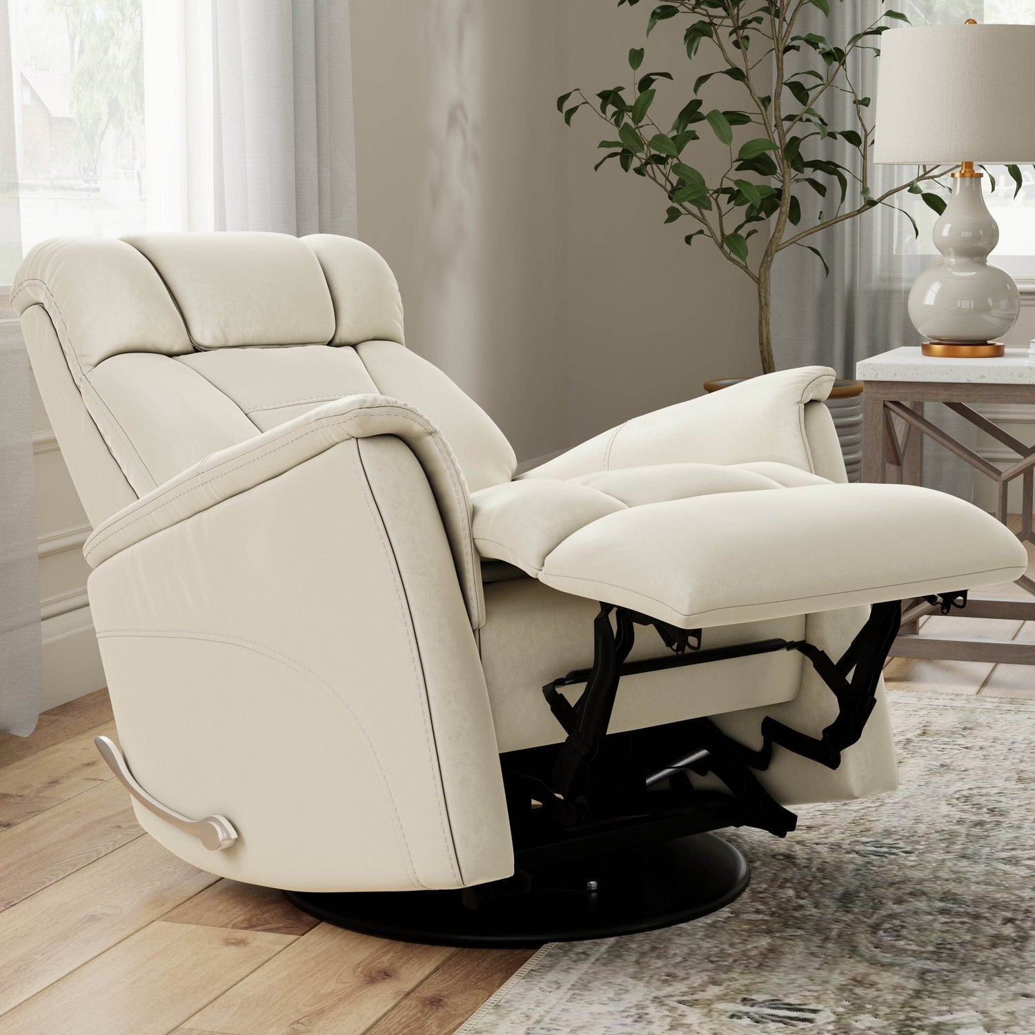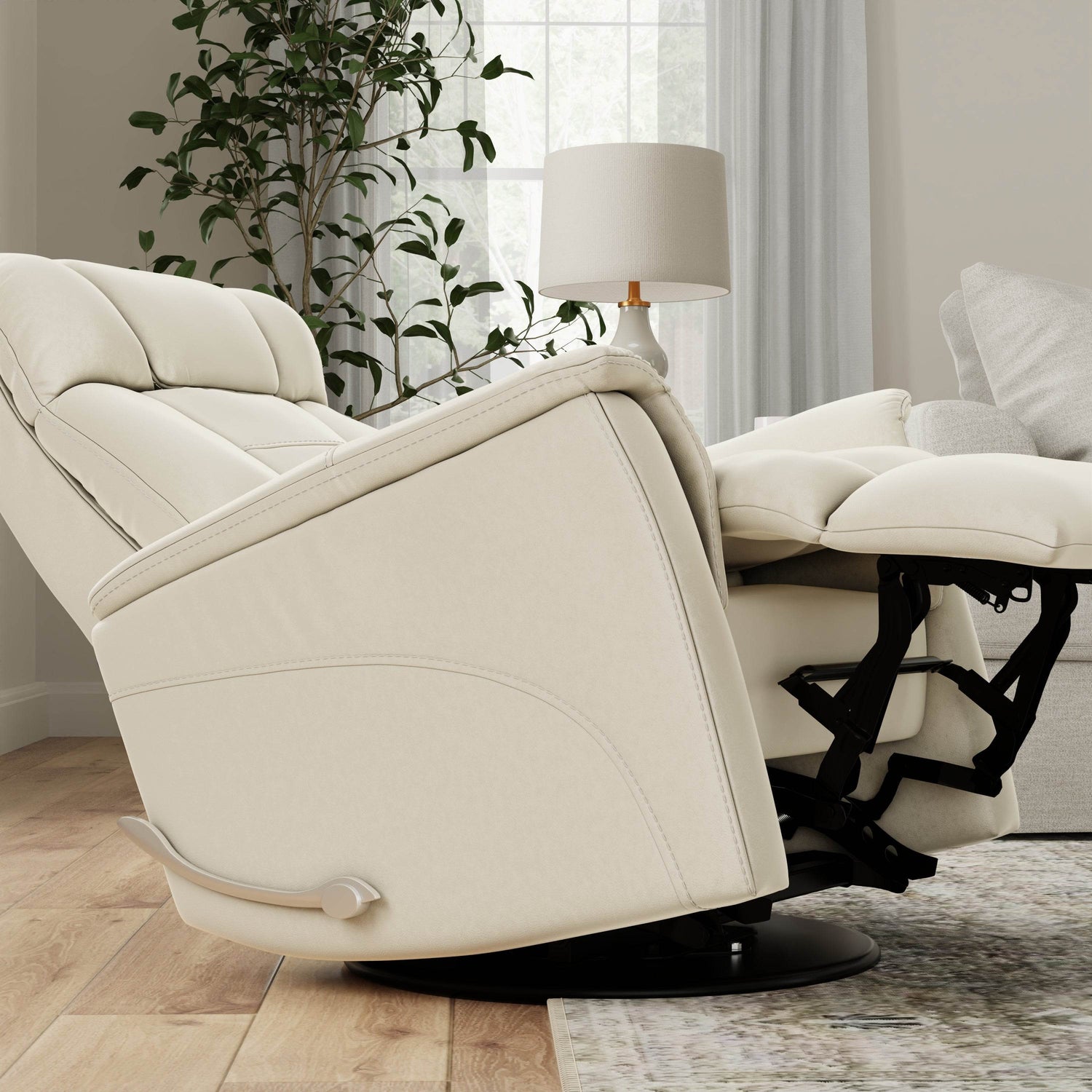 Relax in style and personalized comfort with this swivel glider recliner upholstered in soft Bentley oyster faux leather. Designed for your primary living space, it features smooth 360° swivel motion that lets you move effortlessly without standing up. The manual adjustable headrest and footrest provide customizable support, helping you find the perfect lounging position. Built with a sturdy kiln-dried hardwood and metal frame, this recliner offers long-lasting durability. Dense, high-density foam cushions combined with no-sag suspension ensure plush comfort and reliable support day after day. Its elegant cream color and versatile materials make it a refined addition to any room. Elevate your relaxation today with this stylish and functional recliner.