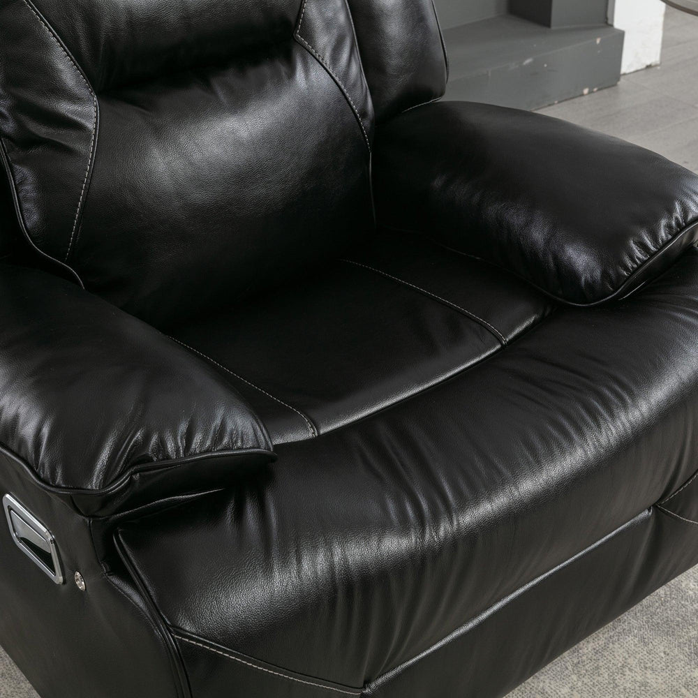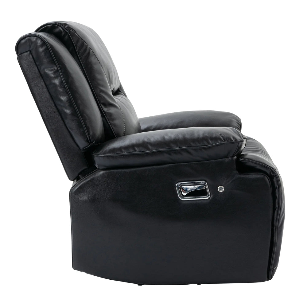 Elevate your home theater or living room with this versatile recliner chair upholstered in sleek black leather gel for durable, easy-to-clean comfort. Designed for ultimate relaxation, it features a smooth manual recline adjustable between 110° and 150°, allowing you to find the perfect seating position. The 360-degree swivel and gentle rocking motion help soothe your body and enhance your entertainment experience. A built-in LED light strip illuminates the floor to prevent trips in the dark while adding a modern cinematic ambiance. Crafted with a sturdy iron and plywood frame, foam cushioning offers plush support paired with wider armrests for superior coziness. Measuring 37 inches deep, 38.7 inches wide, and 40.5 inches high, this durable recliner supports up to 350 pounds. Upgrade your relaxation space today and unwind in style and comfort.