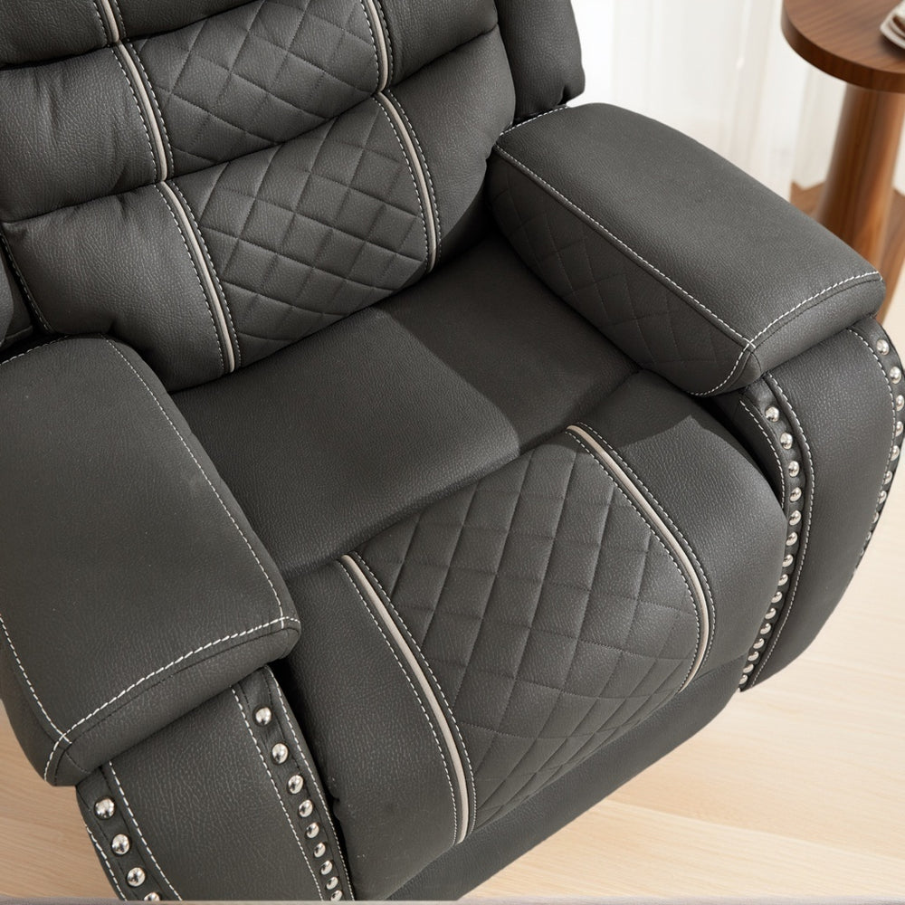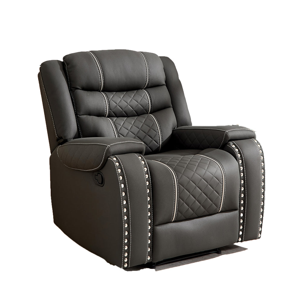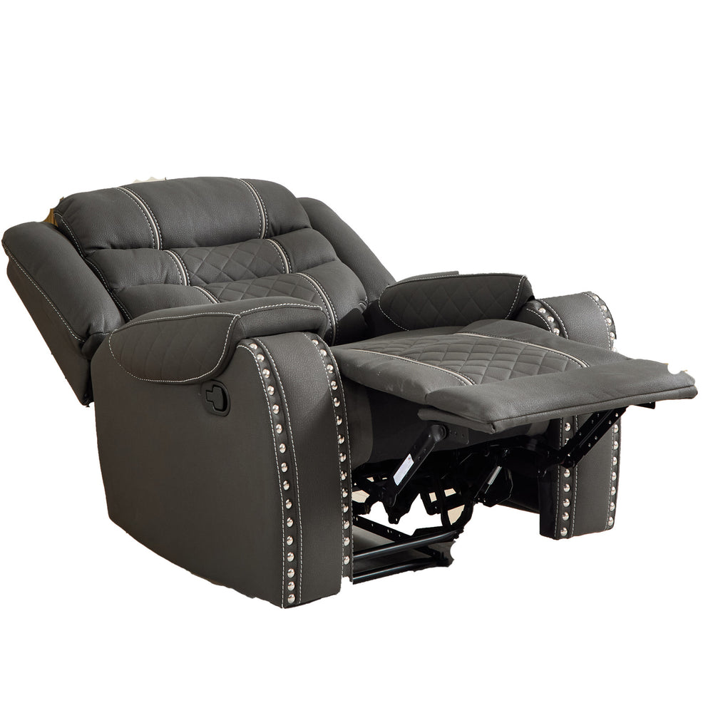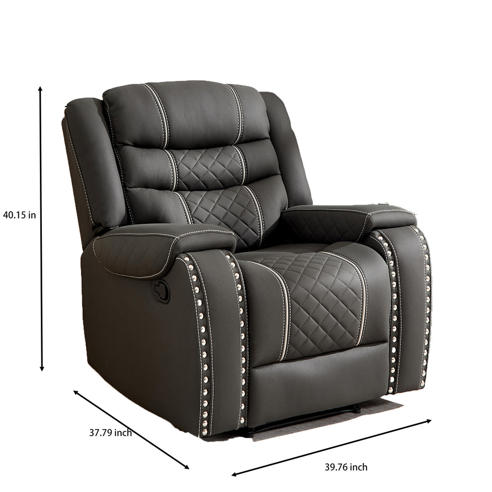 Relax in style and ease with this 1 Seat Recliner Chair, designed to bring comfort and functionality to your living room or dining area. Upholstered in soft, durable microfiber, it offers plush support with high-density foam cushioning that contours to your body. The smooth manual reclining mechanism allows you to effortlessly pull the lever to raise the footrest and lean back up to 155 degrees, ideal for watching TV or enjoying a good book. Classic brass nail accents add a touch of refinement, perfectly blending comfort with timeless design. Measuring approximately 40 inches high, 37 inches wide, and 40 inches deep, it fits comfortably in most spaces. Elevate your lounging experience and add a statement piece for ultimate relaxation today.