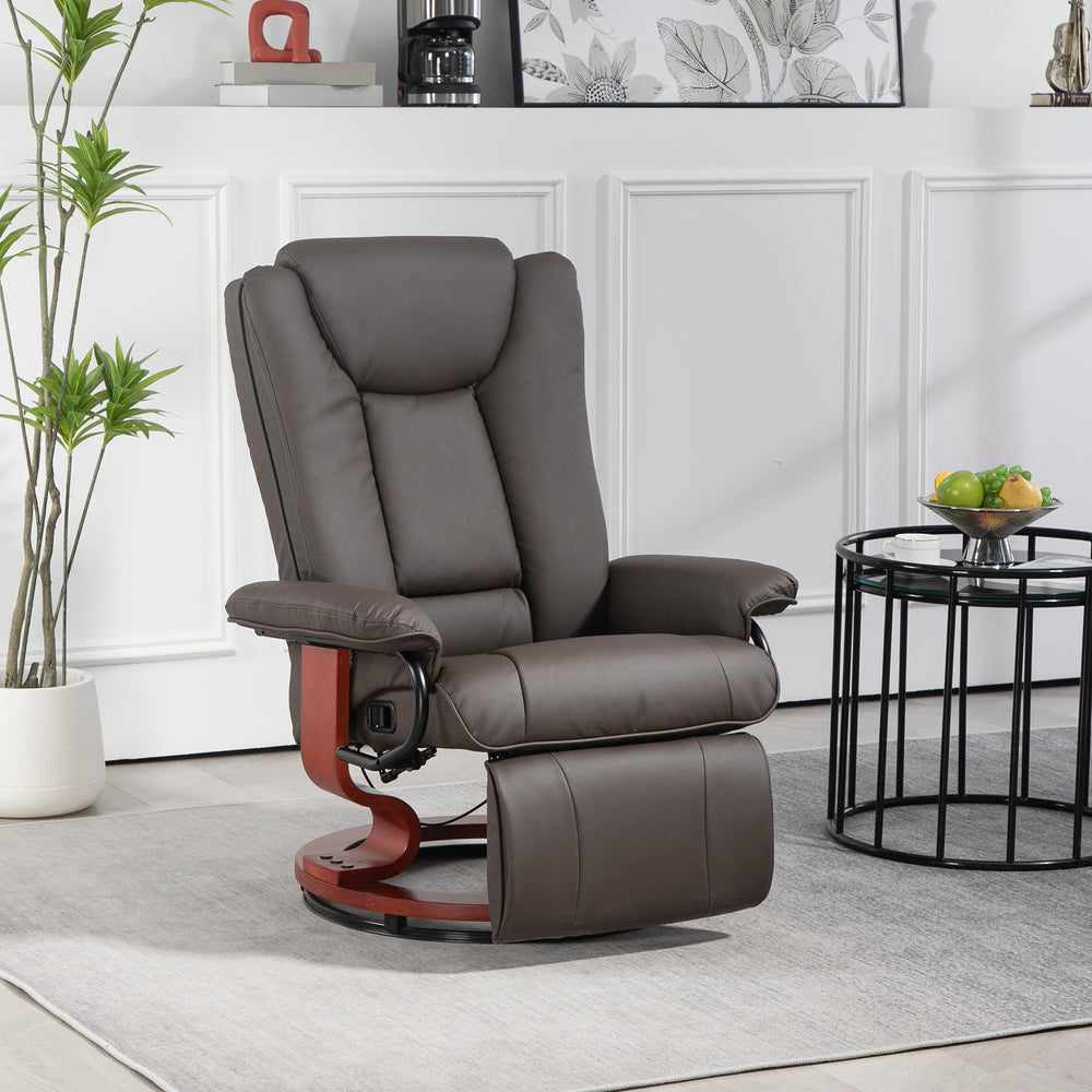 Relax in style and versatility with this brown PU leather recliner chair, perfect for any living room. Designed with a manual reclining mechanism, you can easily adjust the chair up to 135° for customized comfort. The built-in footrest enhances relaxation while the 360° swivel base provides effortless mobility, allowing you to engage from every angle. Thick padded foam and a high back support your posture during long lounging sessions, while the soft yet durable PU leather cover offers easy cleaning and sophisticated appeal. Solidly constructed from multi-layer board and powder-coated steel, this recliner delivers lasting stability and floor protection. Compact yet spacious, it fits well in small spaces without sacrificing comfort. Elevate your living area with this stylish, functional recliner today.