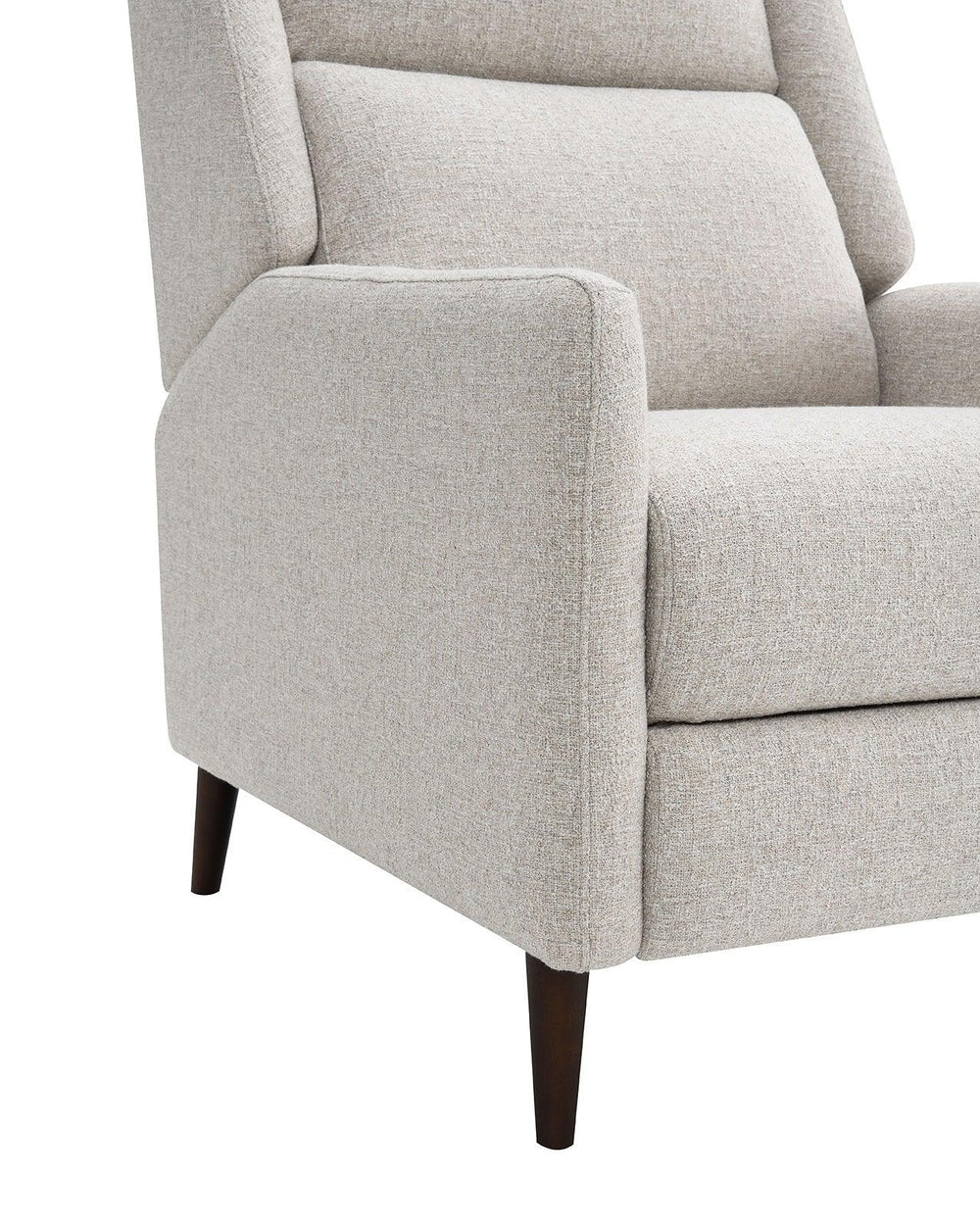 This mid-century modern pushback recliner features a high back with subtle channel detailing and textured linen-look fabric for ergonomic support and durability. Tapered wood legs in dark espresso finish complement any primary living space, enhancing comfort and relaxation.