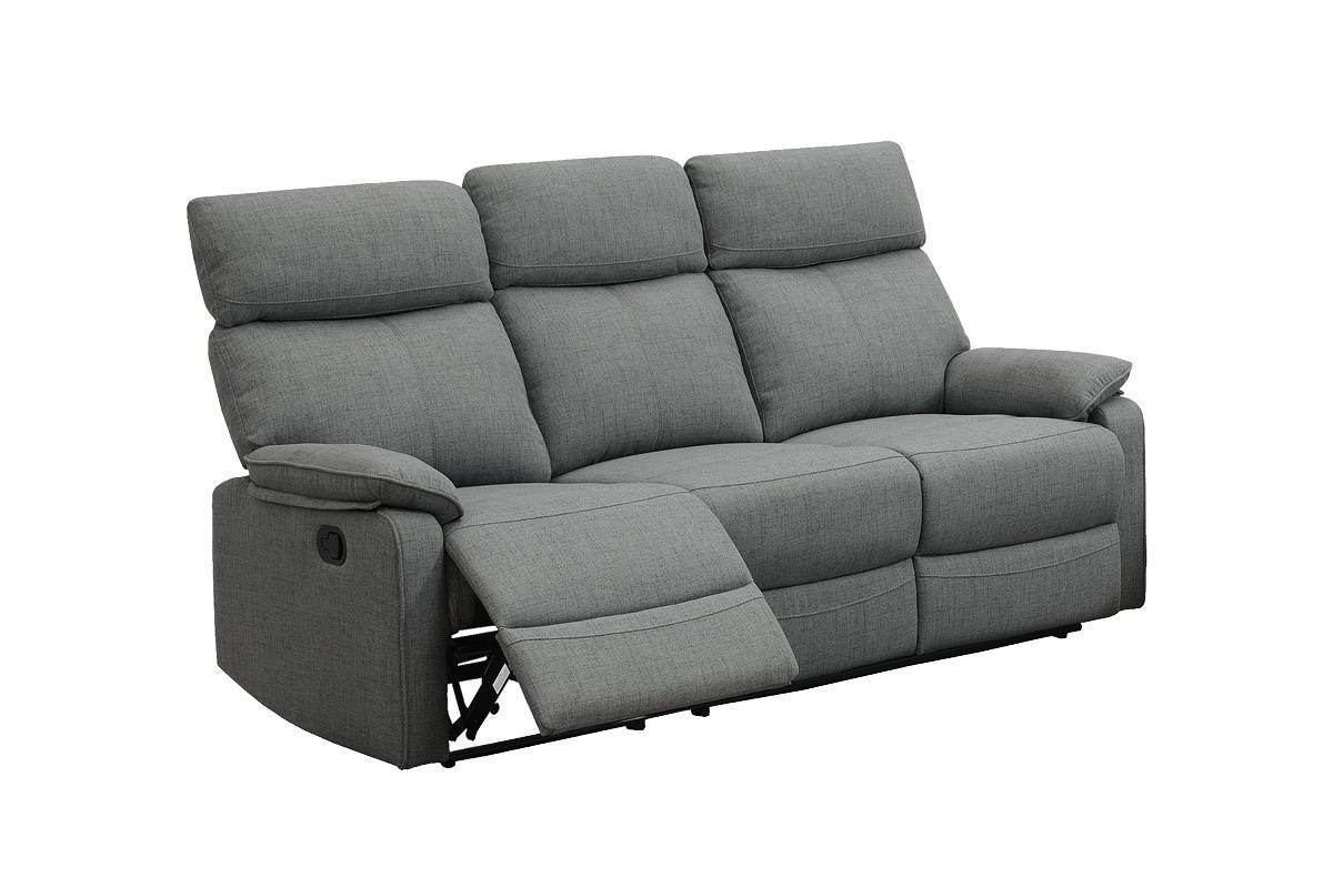 This contemporary gray burlap fabric recliner motion sofa features a high back, padded headrest, and pillow-top arms for enhanced comfort and support. Ideal for primary living spaces, it seats three and offers manual reclining for relaxation.