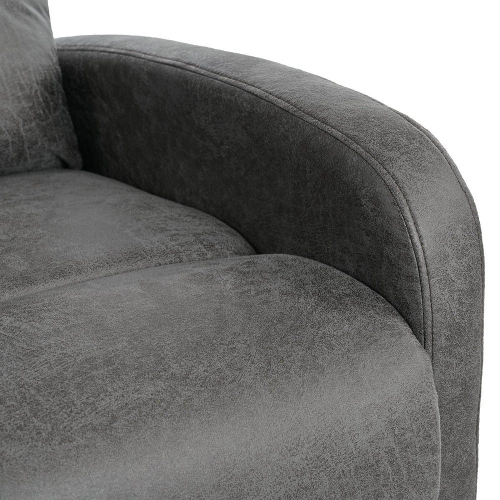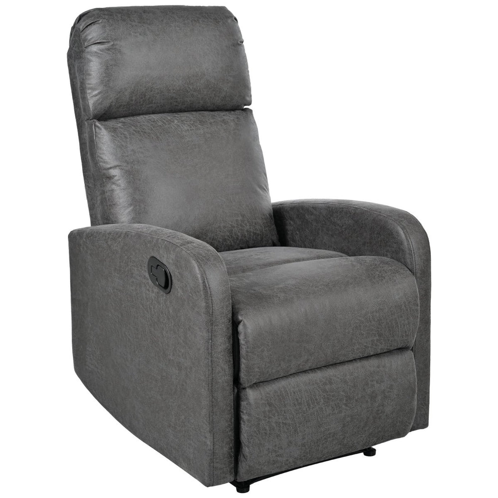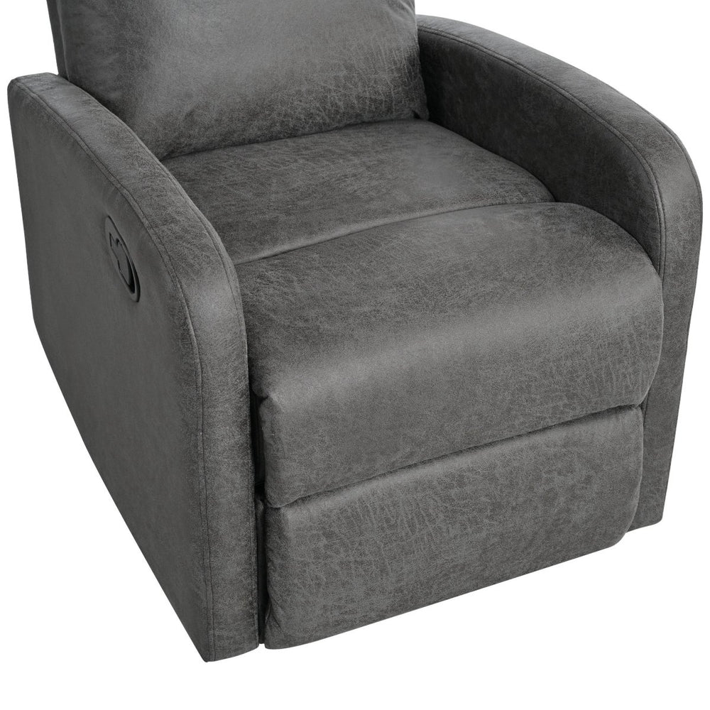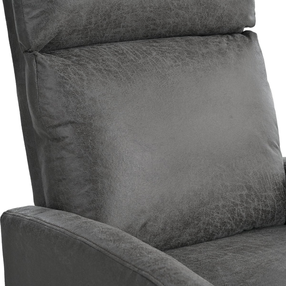 Unwind in style and tailored support with this slate-grey microfiber recliner, designed for your living room’s ultimate comfort. Featuring a manual push-back mechanism with three adjustable recline angles—105°, 120°, and 150°—this chair lets you customize your seating position effortlessly via a built-in side lever. The soft microfiber upholstery and high-density foam cushioning deliver plush comfort while offering durable support for long hours of relaxation. Ergonomically designed with contoured back, neck, and leg support, it promotes healthy posture and reduces strain. Crafted with a sturdy pine and plywood frame complemented by black iron legs, it balances stability with modern aesthetics, perfectly fitting contemporary and classic interiors. Compact yet spacious, this recliner provides deep seating to enhance your lounging experience. Elevate your living space and enjoy personalized comfort today.