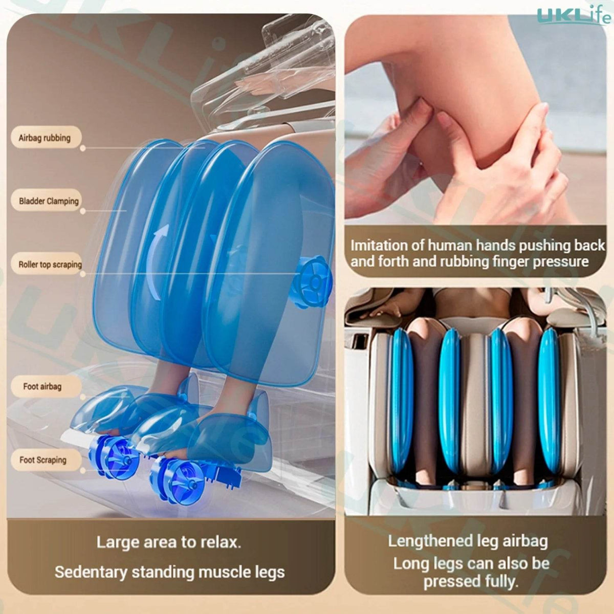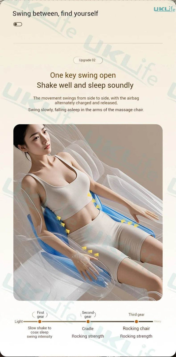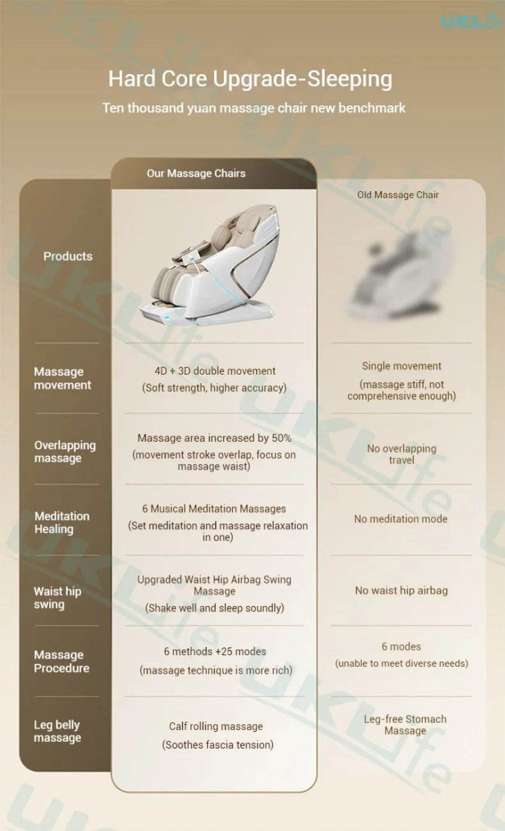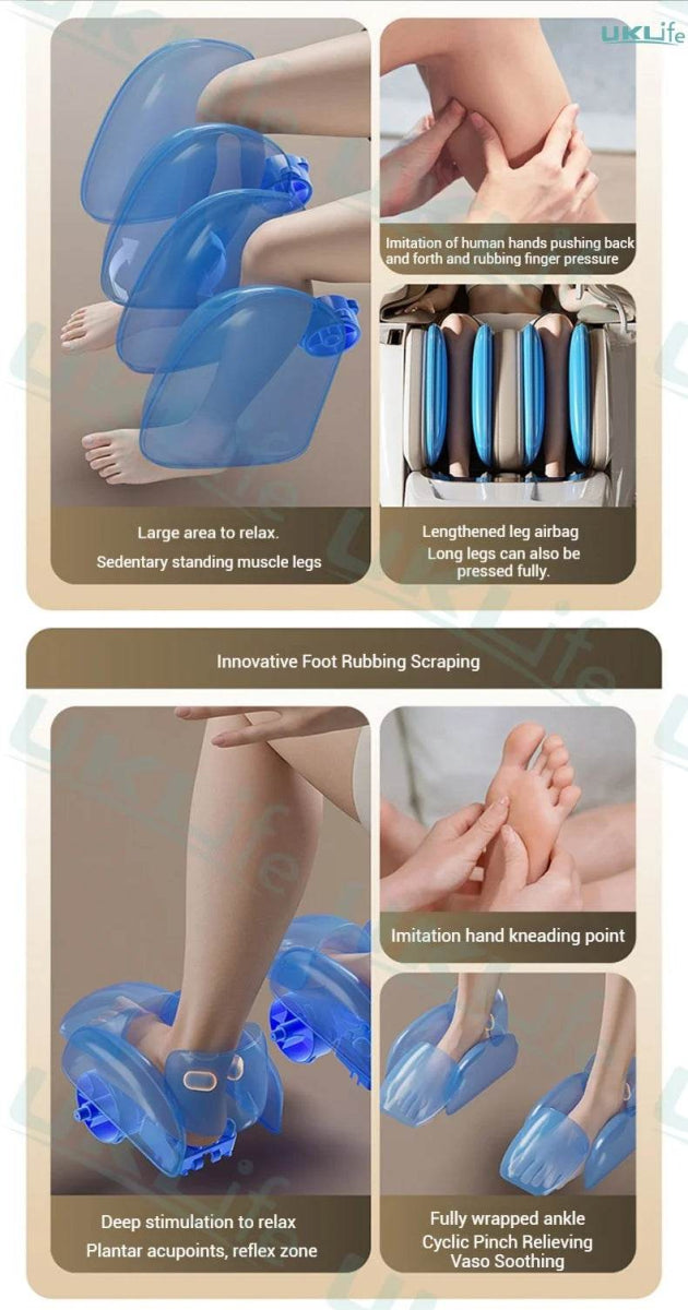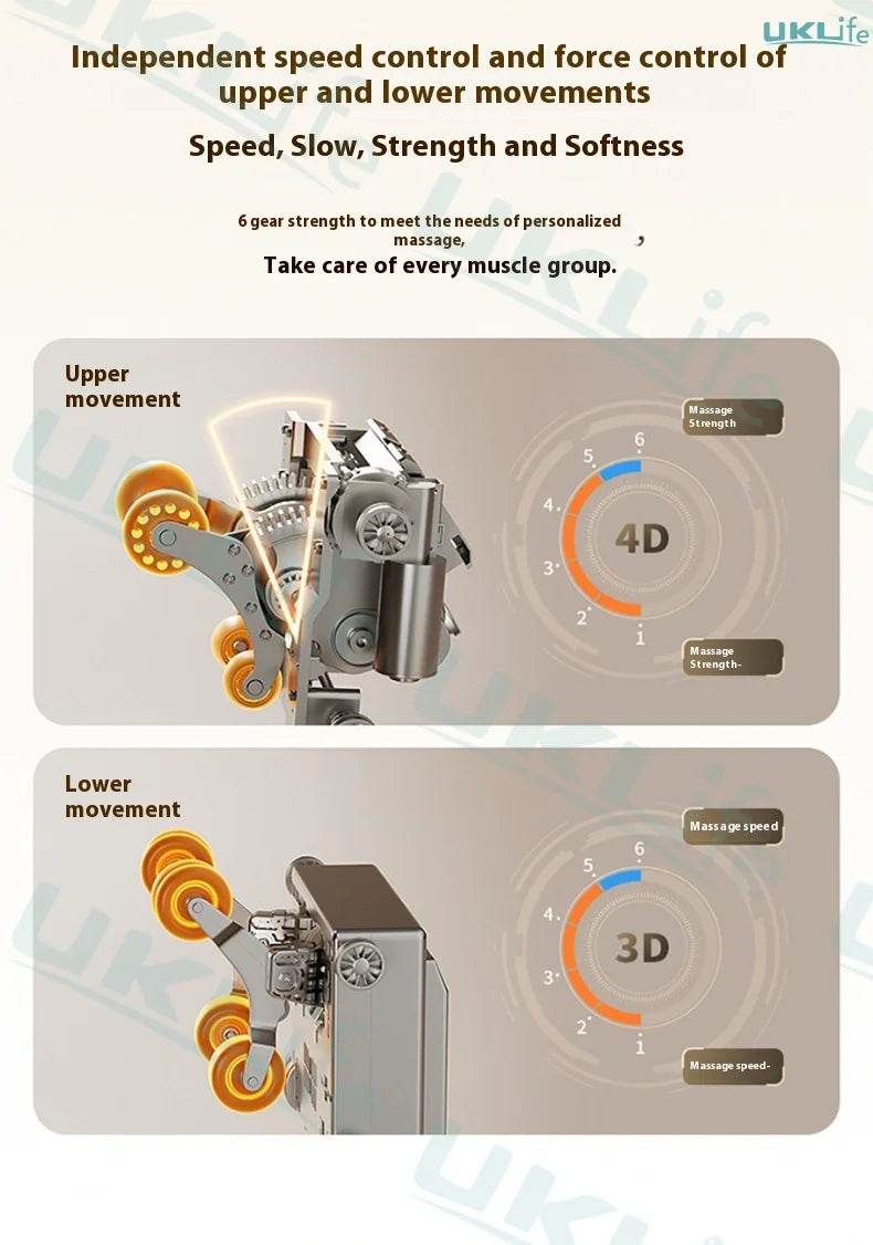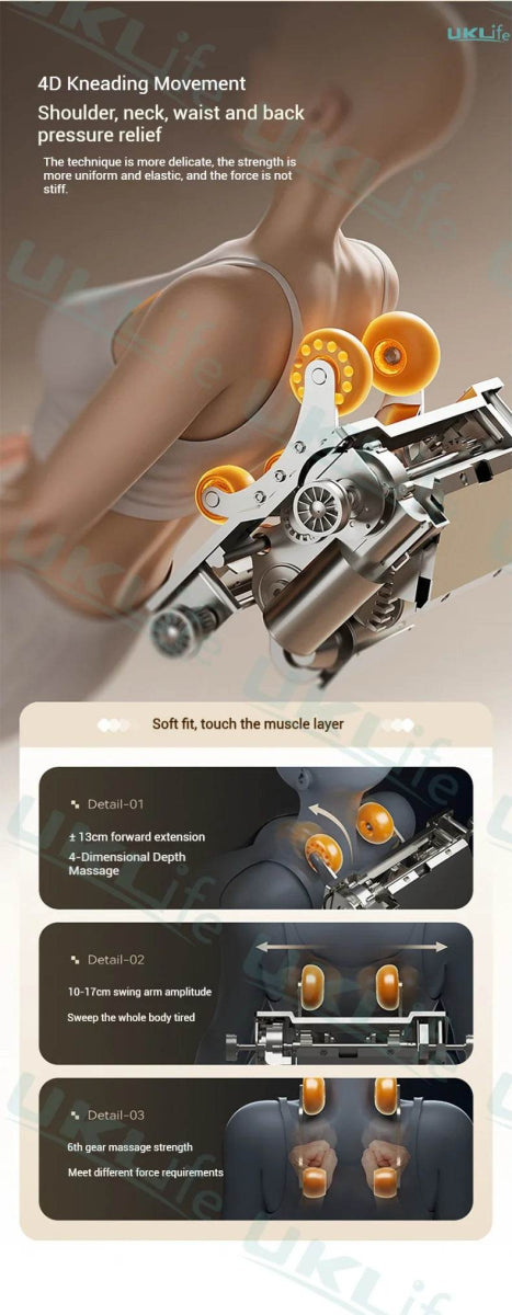 ukLife massage chair features dual-core 4D SL-track for full-body massage, zero gravity positioning, and Thai stretch for enhanced relaxation. Includes AI voice assistant, no harmful chemicals, and comes with a three-year warranty, suitable for neck, back, shoulder, and body relief.