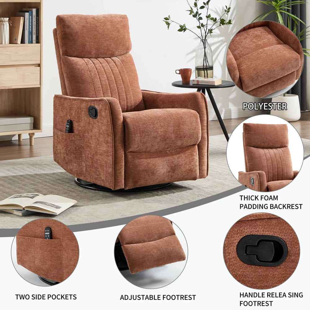 Unwind in style and comfort with this vibrant orange recliner chair, crafted for your primary living space. Upholstered in soft chenille fabric and filled with fiber foam and polyester padding, it offers medium-firm support that cradles your body perfectly. The manual handle lets you recline up to 155 degrees, allowing you to find your ideal resting position. Enjoy the smooth 360-degree swivel and gentle rocking feature built on a sturdy black metal base, adding dynamic comfort to your relaxation. Integrated massage and lumbar heat functions, with eight targeted vibrating nodes and three massage modes, soothe tired muscles and enhance circulation for complete full-body relief. Easy to assemble in about 10 minutes without tools, this American-styled recliner with square arms and cushion back is the perfect blend of functionality and modern design. Elevate your relaxation today and bring home a chair that transforms your living room experience.