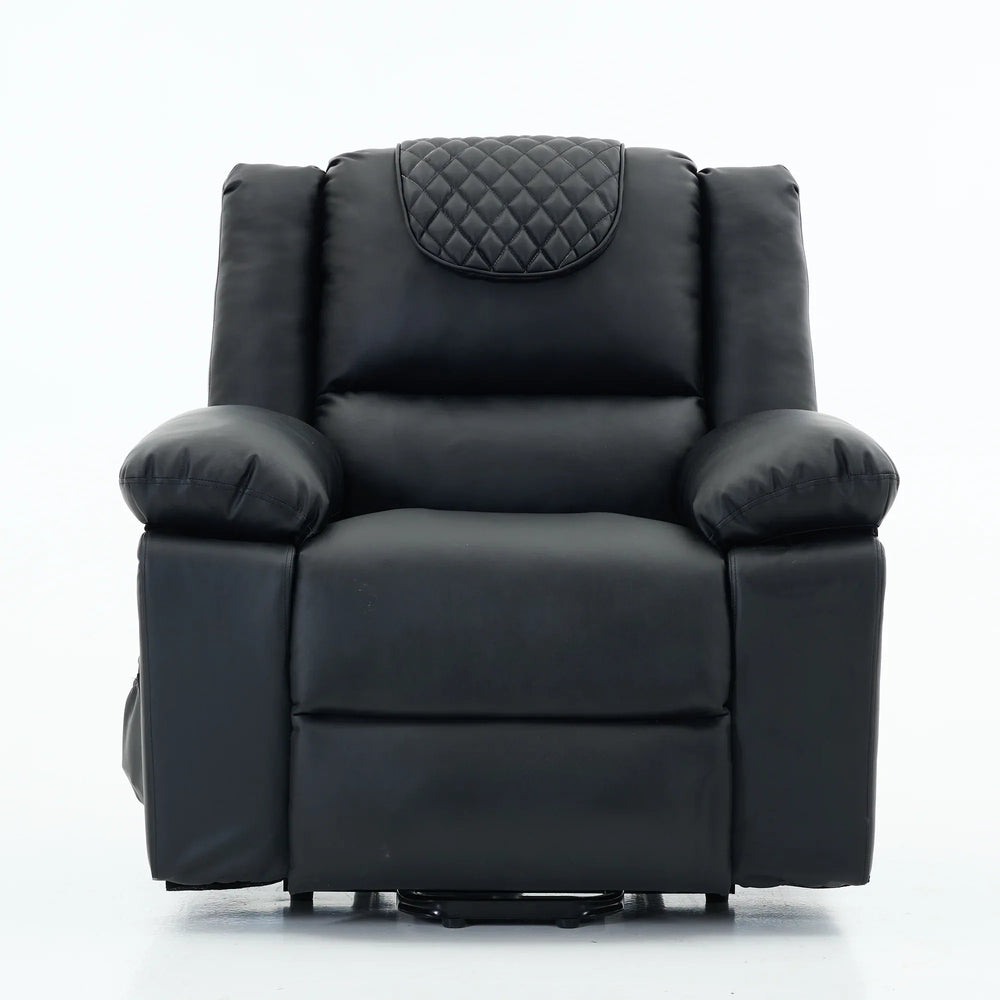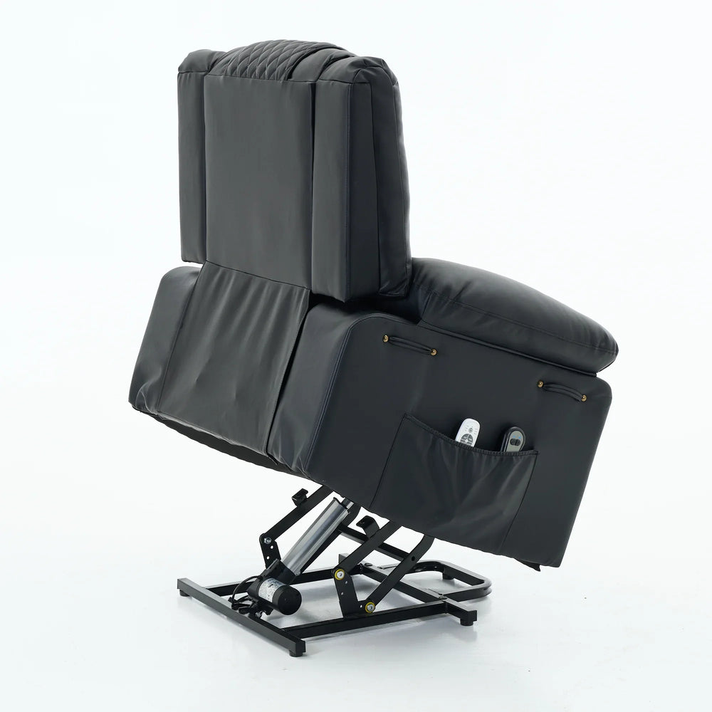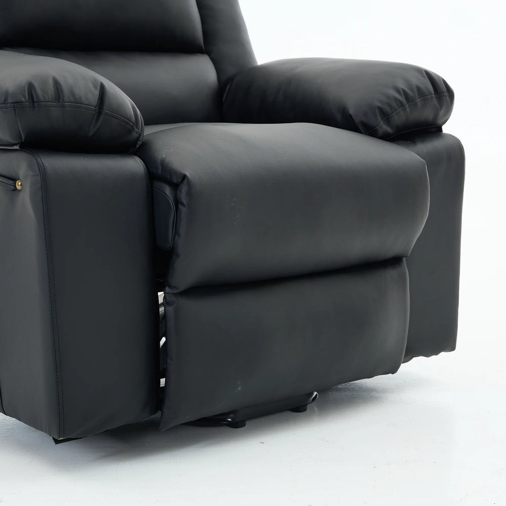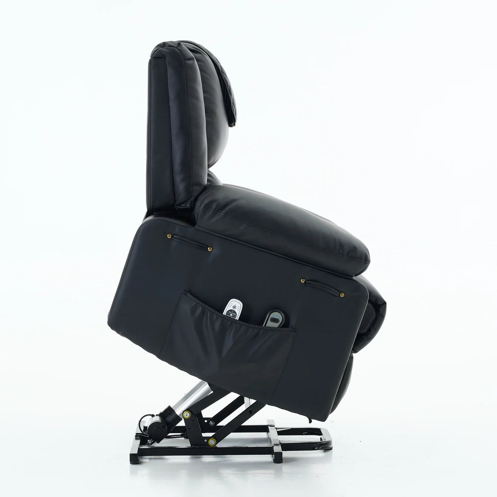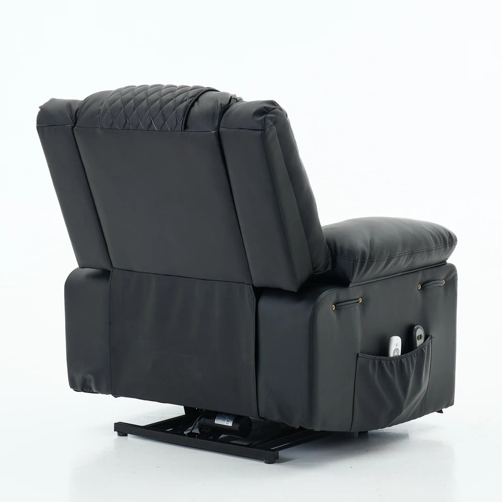 Upgrade your living space with this premium assistive recliner, thoughtfully designed to enhance comfort and mobility for seniors. Upholstered in smooth black PU leather and cushioned with supportive foam, this recliner combines classic American design with modern luxury. The built-in heating system gently warms muscles to ease stiffness, while the integrated massage feature targets key areas, relieving tension and boosting circulation for overall wellness. A power-remote control allows effortless adjustment of reclining positions and massage settings, making relaxation fully customizable. The sturdy metal frame and pillow back offer lasting durability and medium-firm plushness that supports restful seating. Plus, the assistive mechanism helps users stand easily and safely. Perfect for any primary living space, this recliner makes comfort and independence accessible. Elevate your relaxation today.