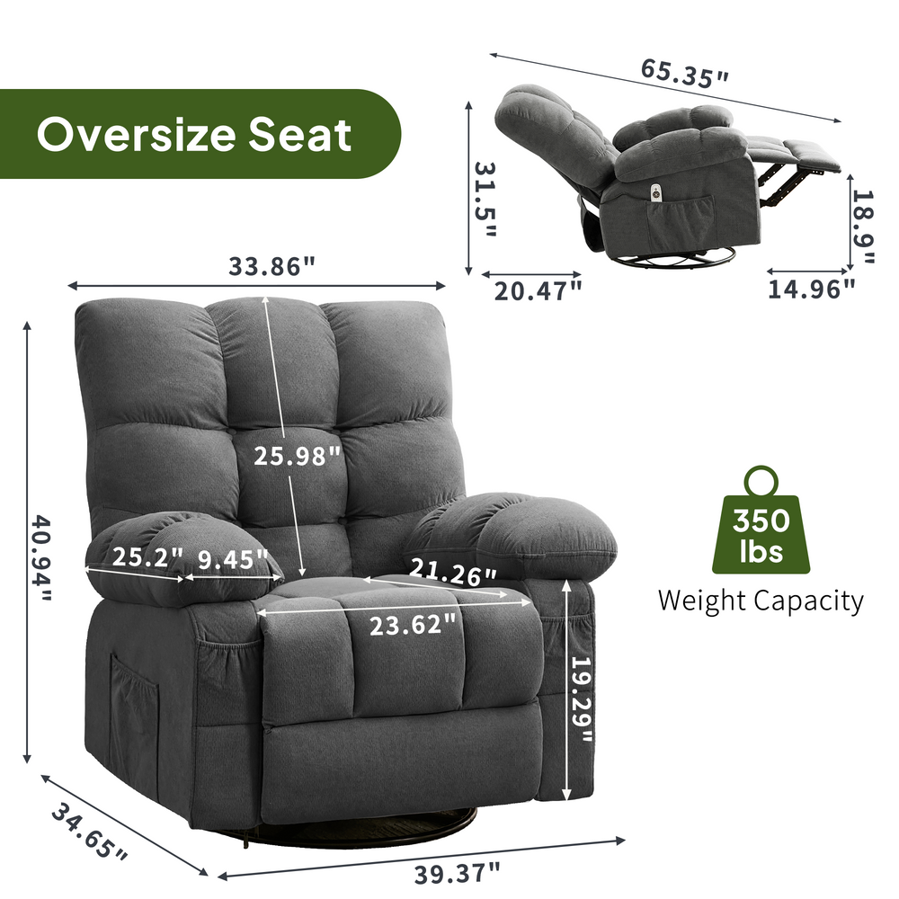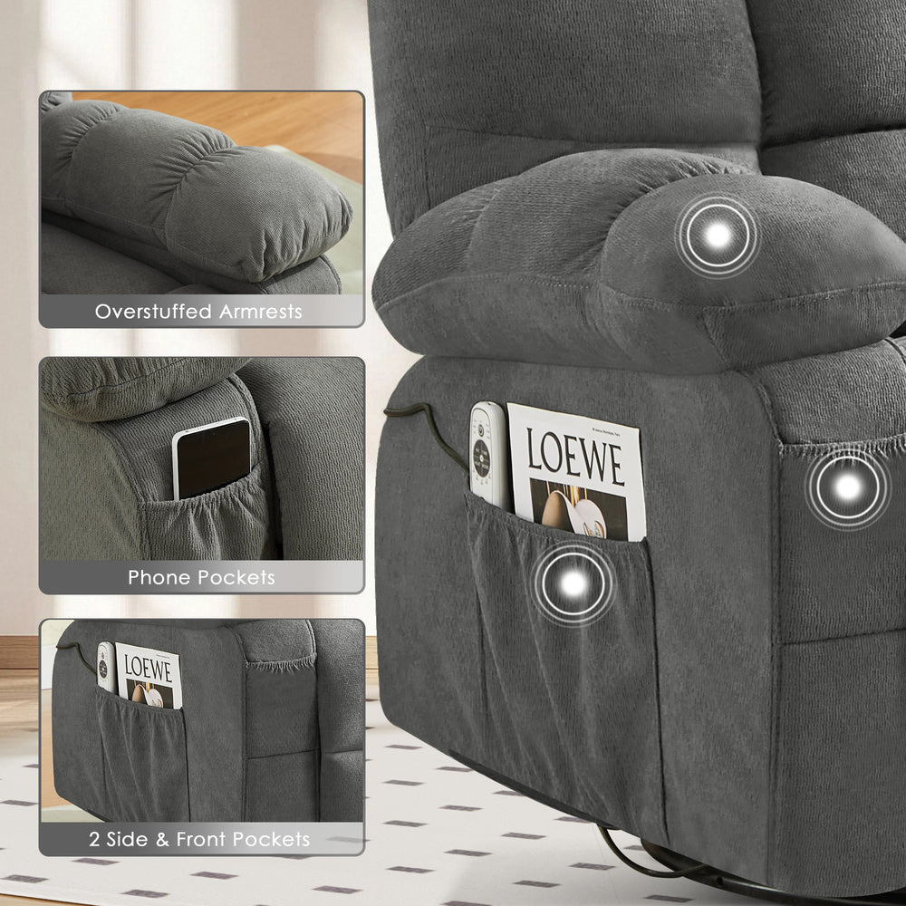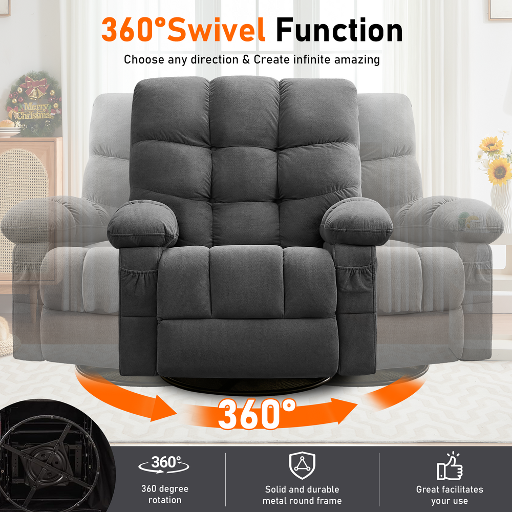 Upgrade your living space with this oversized massage swivel recliner chair, designed for maximum comfort and relief. Featuring a spacious 23.6-inch wide seat and a widened footrest, it provides ample room for larger adults to unwind fully. The soft, high-density foam padding on the headrest, backrest, and armrests cushions your body while the recline function extends up to 155 degrees for ideal lounging. Enjoy targeted vibration massage with 8 nodes and soothing lumbar heating that boosts circulation and eases tension. The chair swivels a full 360 degrees and rocks smoothly up to 30 degrees, perfect for reading, watching TV, or resting. Integrated pockets keep your essentials organized, and a convenient USB charging port ensures your devices stay powered. Built with a durable metal frame supporting up to 350 pounds, this recliner blends functionality with sturdy reliability. Elevate your relaxation today with this versatile massage recliner.