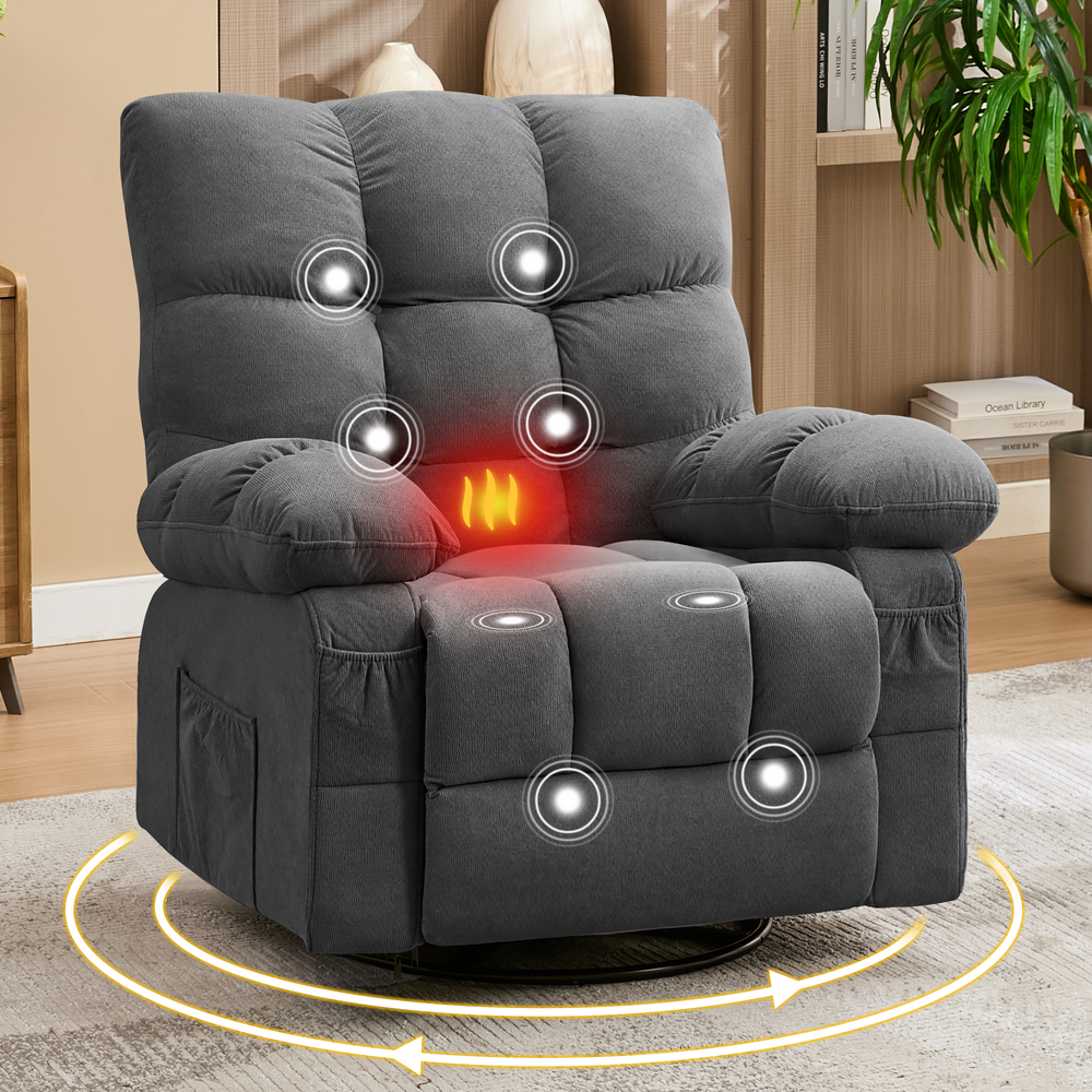 Massage swivel recliner chair features an expanded seat and widened footrest for spacious comfort, with 8 vibrating massage nodes and lumbar heating to relieve pressure and improve circulation. It offers 360-degree swivel, rocking, USB charging, and supports up to 350 lbs for primary living spaces.