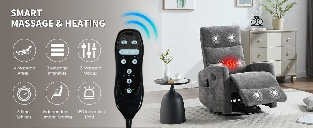 Unwind in style and comfort with this grey fabric recliner chair designed for your living room. Featuring a smooth 360° swivel base and gentle rocking function, this chair adapts to your preferred seating position with an easy-to-use recliner handle, reclining up to 155 degrees. Enjoy targeted massage with 8 vibrating nodes covering back, lumbar, thighs, and legs, plus 3 massage modes for customizable relief. The added lumbar heat boosts circulation and soothing warmth for full-body relaxation. Upholstered in durable chenille fabric with medium-firm cushioning, this chair combines comfort and support while its heavy-duty metal and pine wood frame ensures stability. Designed with square arms and a cushioned back, it complements American-style interiors and is easy to assemble without tools. Elevate your relaxation today with this versatile massage recliner.