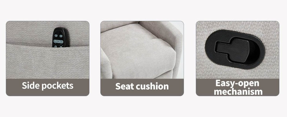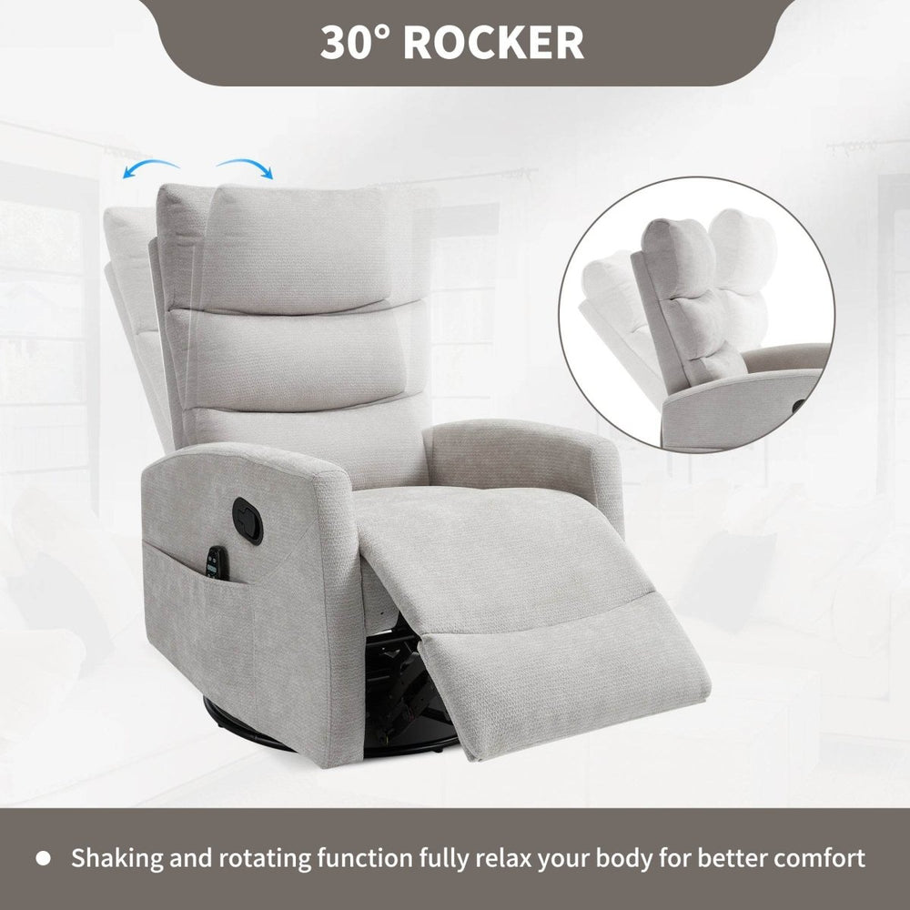 Enhance your living room with this versatile grey recliner chair, designed for ultimate comfort and soothing massage relief. Upholstered in soft chenille fabric, it features a sturdy metal and pine wood frame that blends durability with natural style. The chair offers a smooth 360° swivel and gentle rocking motion, allowing you to find your perfect relaxation position with ease. Recline up to 155 degrees using the convenient handle for personalized comfort. Equipped with 8 vibrating massage nodes targeting your back, lumbar, thighs, and legs, plus 3 adjustable massage modes and a lumbar heat function, this recliner promotes blood circulation and full-body relief. Its medium-firm cushion ensures support without sacrificing plushness, making it ideal for unwinding after a long day. Enjoy effortless assembly with no tools required. Elevate your relaxation today with this multi-functional massage recliner.