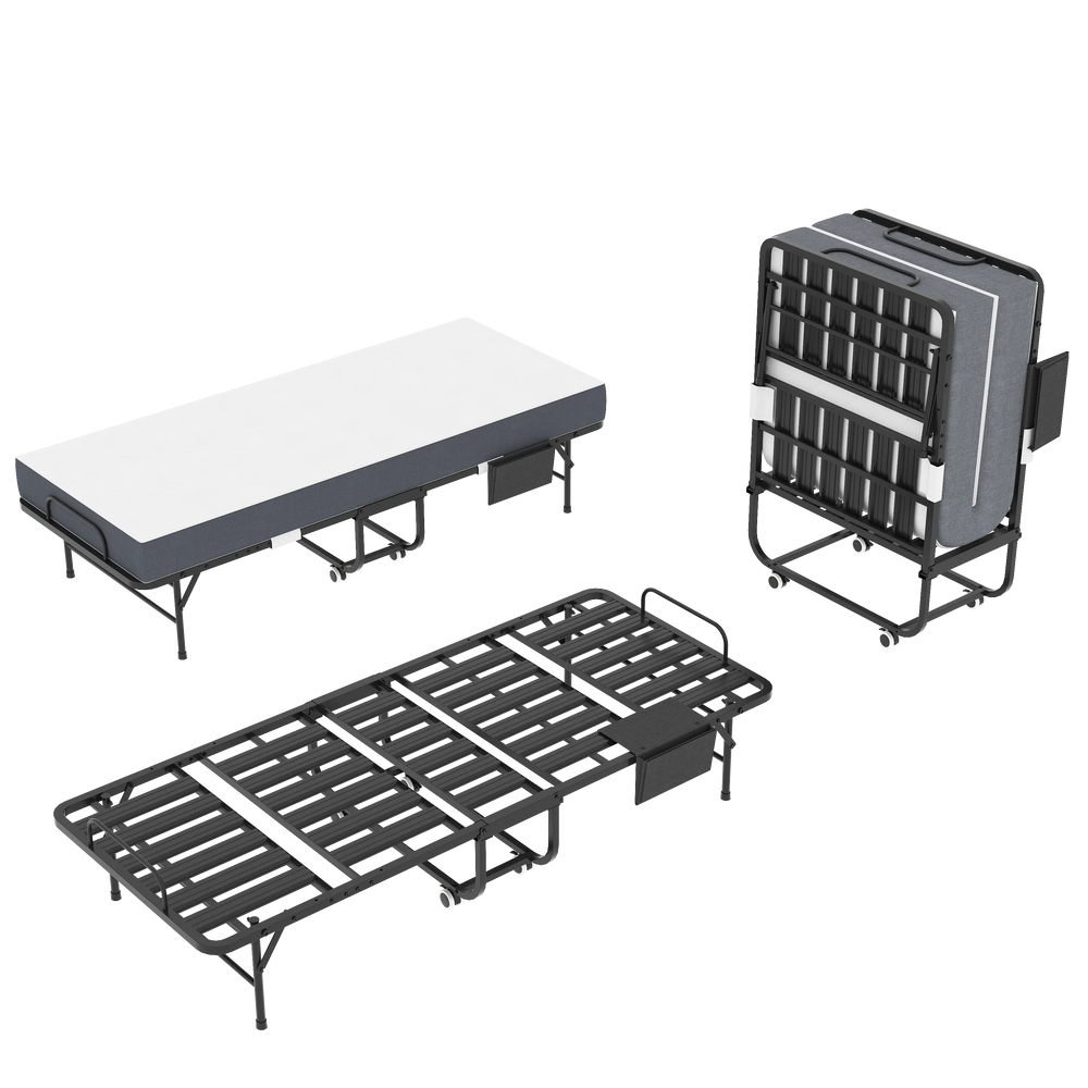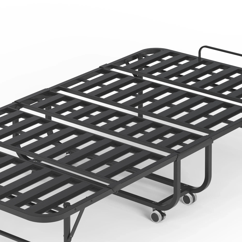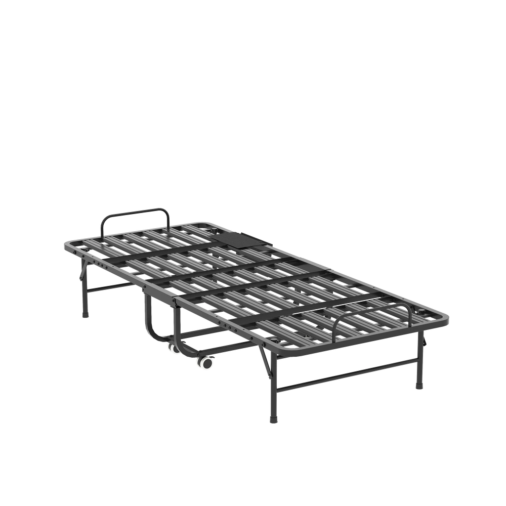 This modern black metal twin bed frame features a durable 450lbs capacity with 360-degree locking wheels for easy mobility. Its space-saving foldable design and supportive 5-inch memory foam mattress offer comfortable rest in compact bedrooms or guest rooms.
