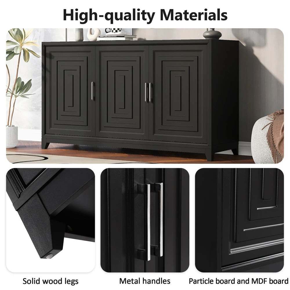 Modern TV stand with sleek black particle board and MDF construction offers sturdy support for TVs up to 65 inches. Features two spacious cabinets with adjustable shelves for versatile storage, solid wood legs for stability, cable management, and easy assembly for living or media rooms.