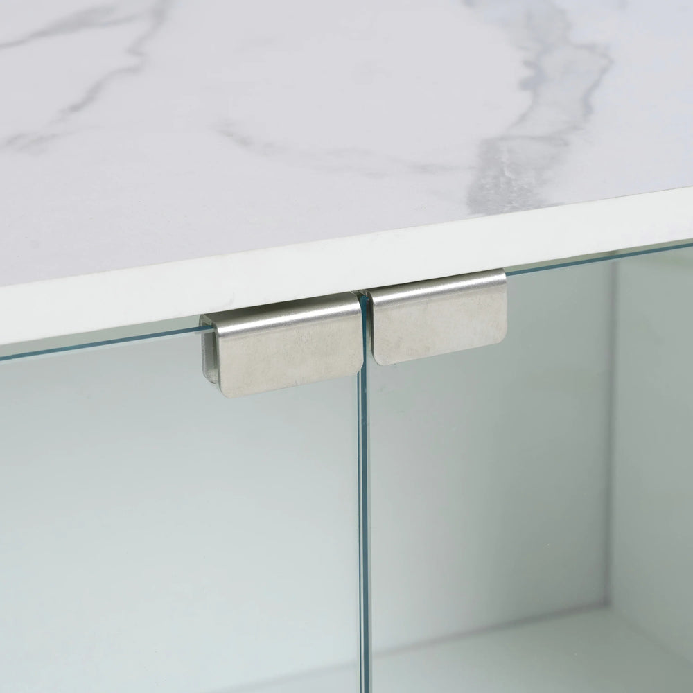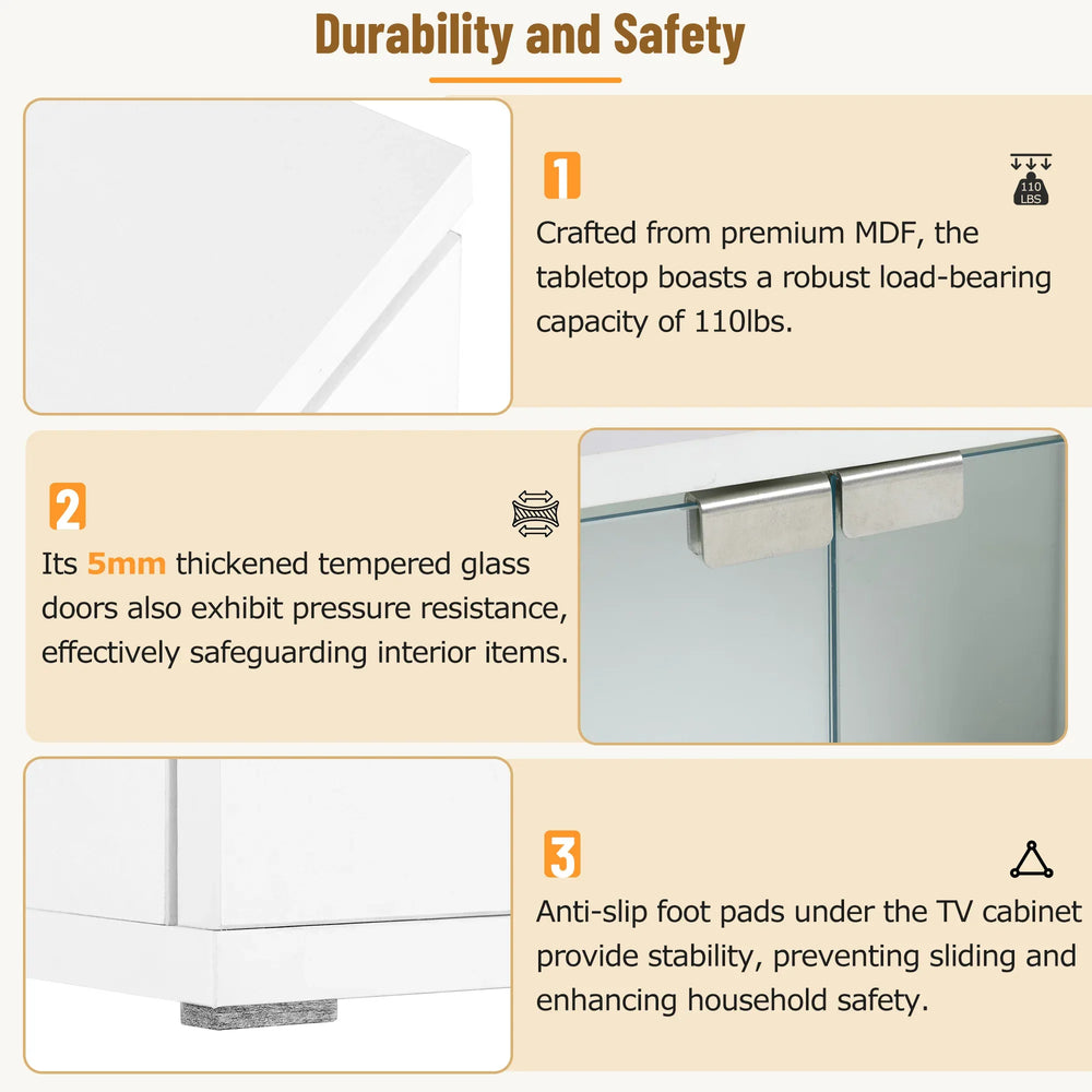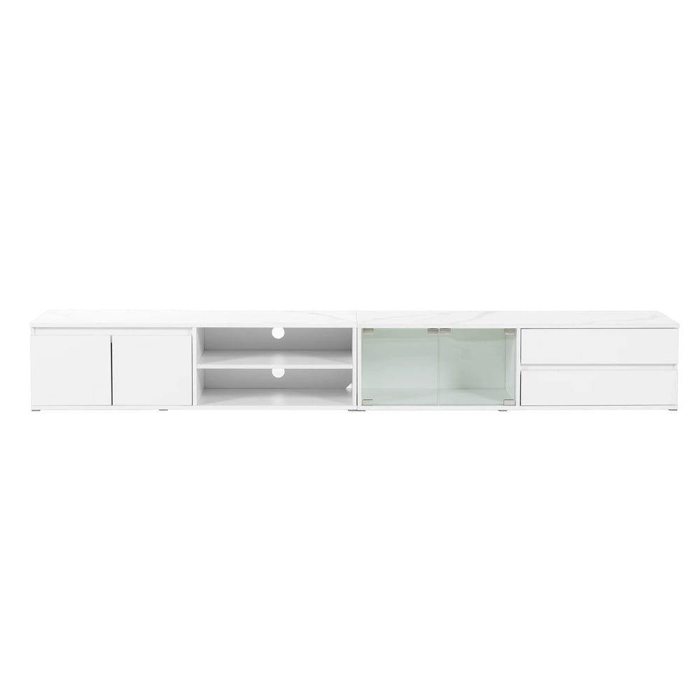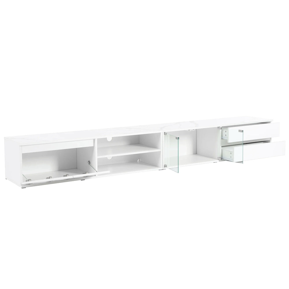 This modern white TV Stand features an imitation marble MDF tabletop with a 110lb load capacity, two drawers, tempered glass doors, and wireless app-controlled adjustable LED lighting for customizable ambiance and organized living room storage.