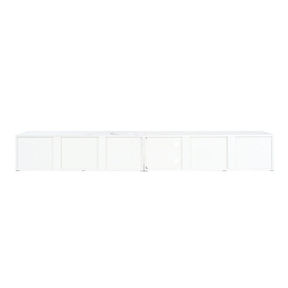 This sleek and spacious TV stand offers a perfect blend of contemporary design and smart technology to elevate your home entertainment setup. The faux marble tabletop adds an elegant, high-end look that complements any décor, while the particle board and MDF construction ensures durability and sturdiness. Easily control the adjustable LED lighting via your mobile app to create personalized ambiance with customizable colors and brightness levels. Thoughtfully designed with two drawers, cabinets with tempered glass doors, and open shelving, it provides ample storage and organization for your media devices, gaming consoles, and decor. Cable management holes keep wires neat and out of sight, maintaining a clean, modern aesthetic. Anti-slip foot pads enhance stability and safety on any floor. Perfectly sized to support TVs up to 105 inches, this media console combines style, functionality, and smart features to transform your living space. Elevate your entertainment experience today.