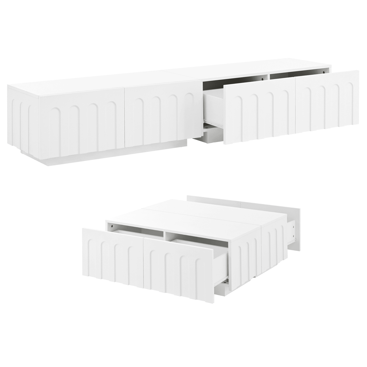 This versatile TV Stand & Coffee Table Set combines two separate MDF units with elegant arched drawer fronts for a modern look. Offering ample hidden storage with eight metal-slide drawers, it adapts between a sleek TV console and stylish coffee table, enhancing living room organization.