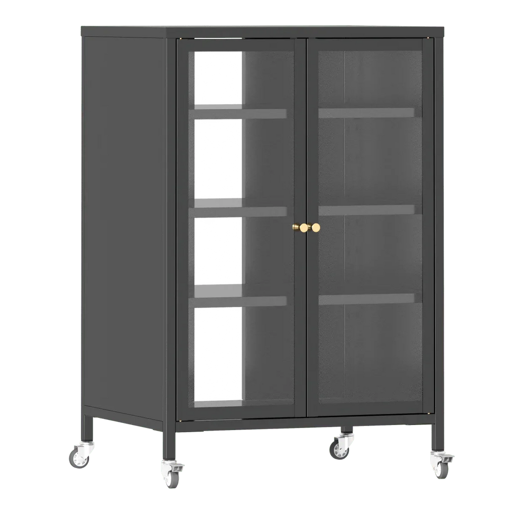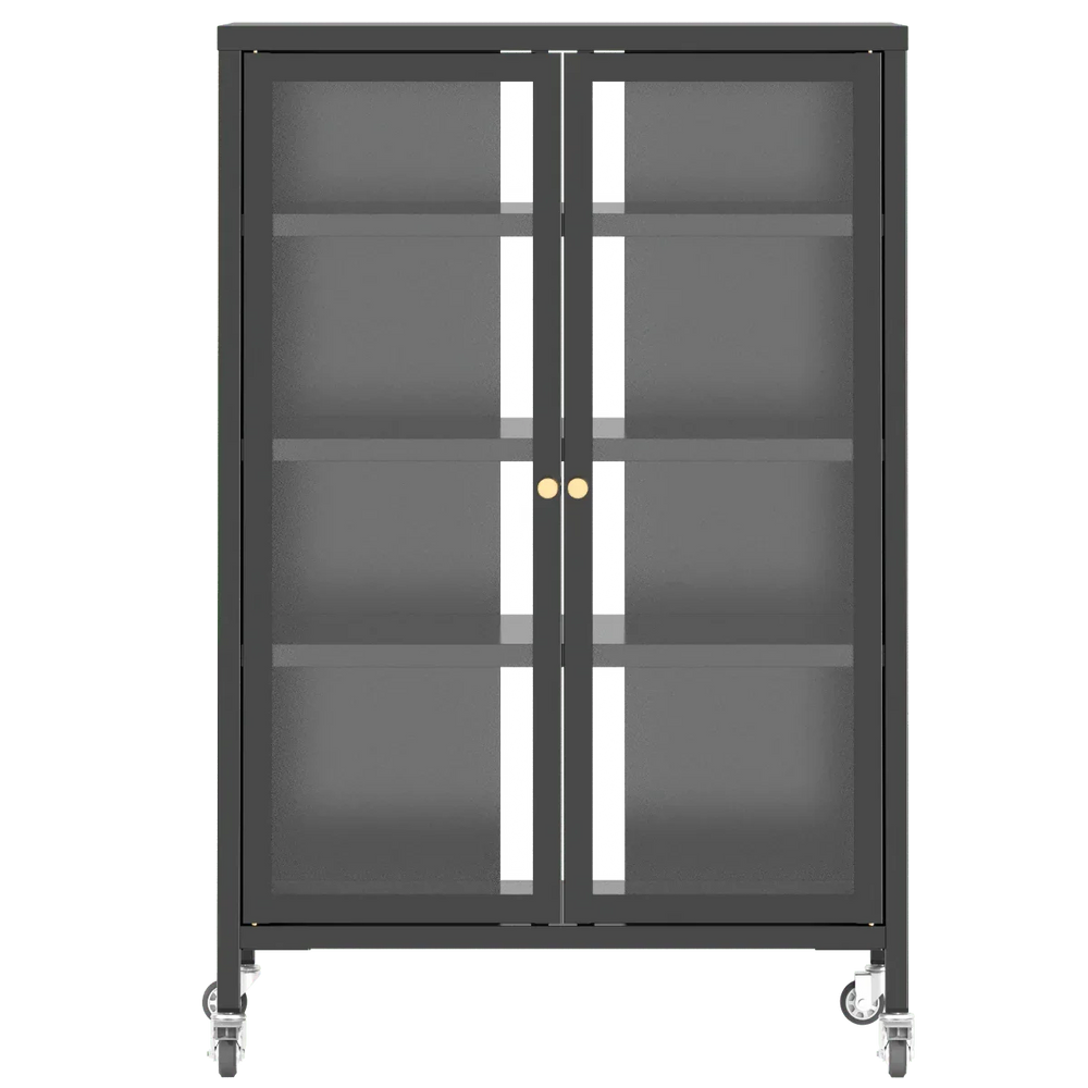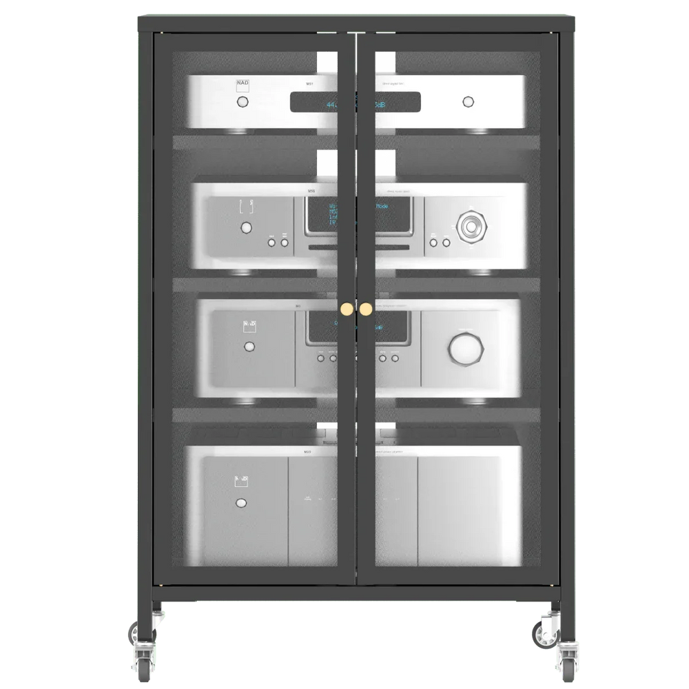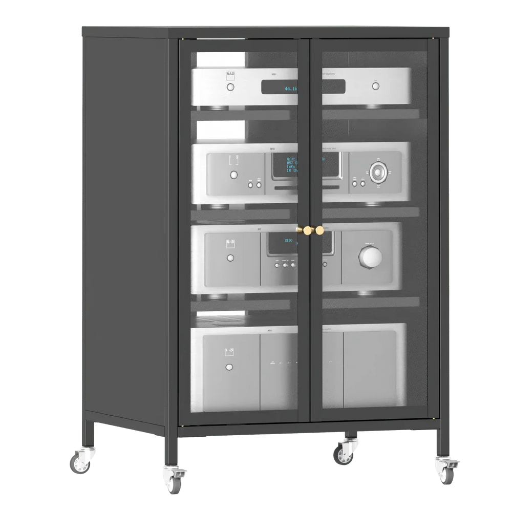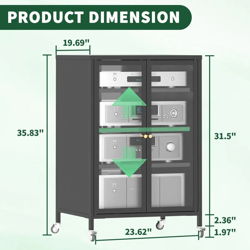 Streamline your living room setup with this sleek 35.8-inch high media storage cabinet, designed to tame clutter and protect your AV equipment. Featuring four spacious shelves—three fully adjustable—you can customize your storage to fit game consoles, receivers, streaming devices, and your entire media collection. The tempered glass doors provide a dust-proof display that keeps your components visible yet safe from pets and accidental bumps. Built with a heavy-duty cold-rolled steel frame, this durable cabinet supports your heaviest electronics with stability you can trust. Move or reposition your entertainment hub effortlessly using the four rolling caster wheels, two of which lock securely to keep your setup in place. Integrated cable management ports reduce cord clutter and the open-back design enhances airflow, helping your devices stay cool. Easy to assemble with included tools and step-by-step instructions, this media cabinet brings order and style to your space. Elevate your home entertainment organization today.