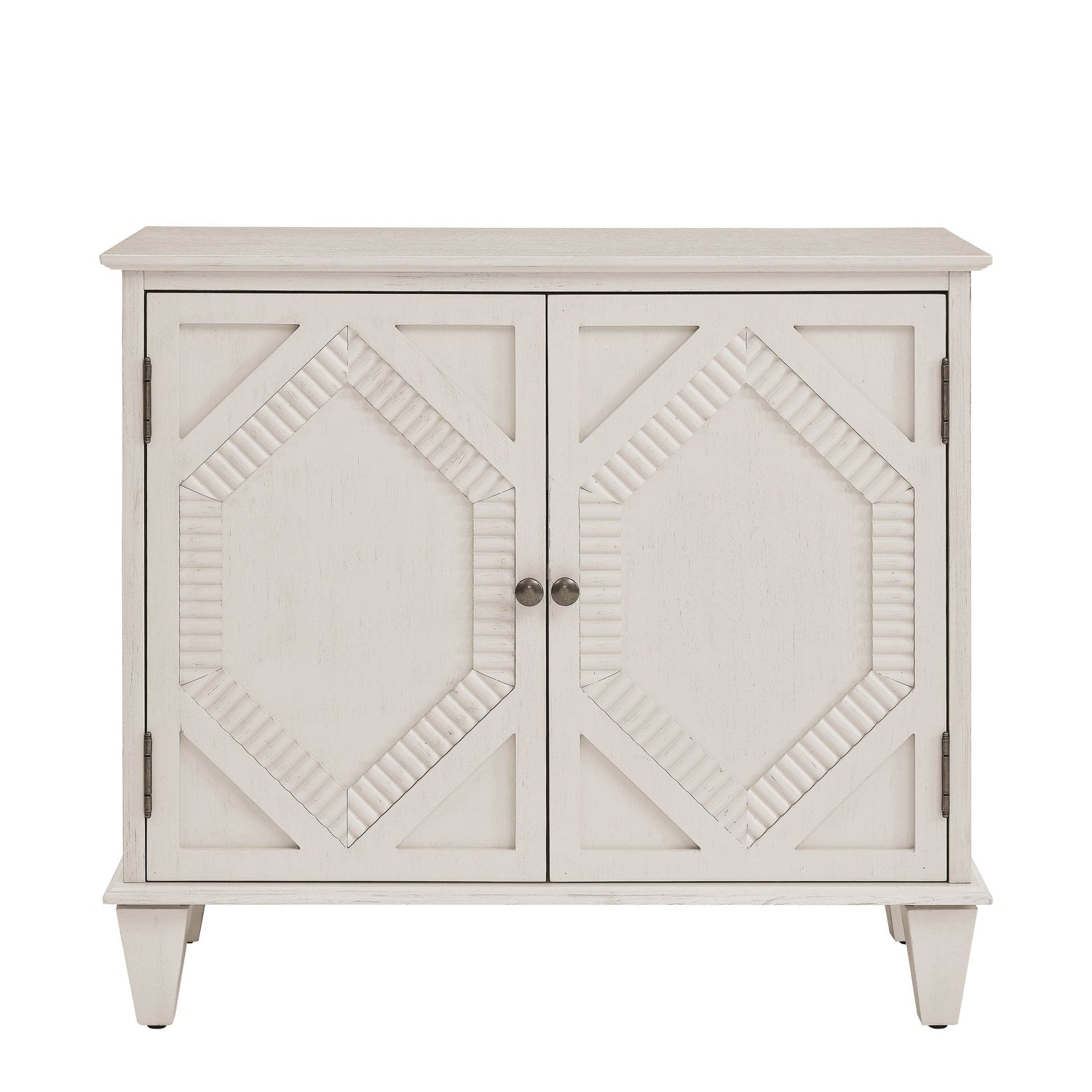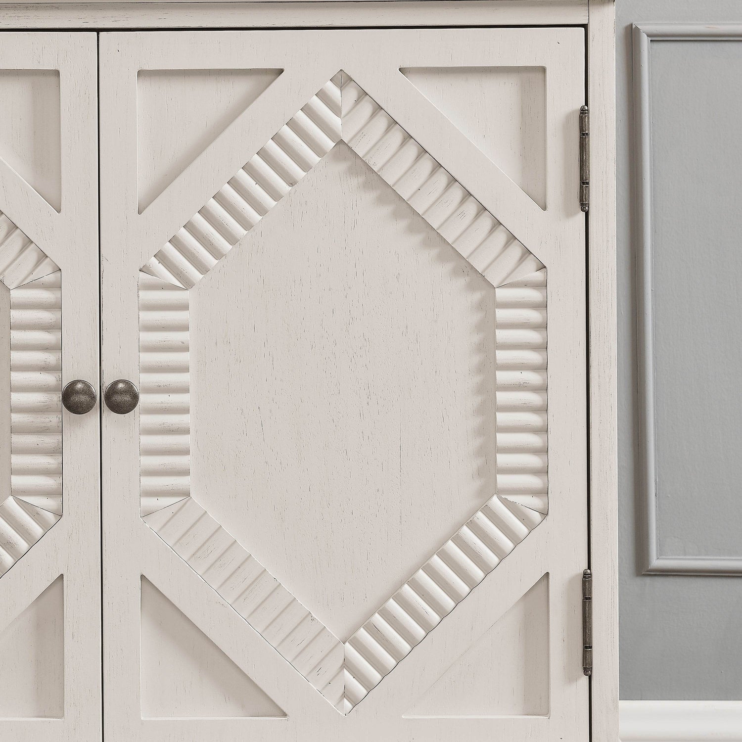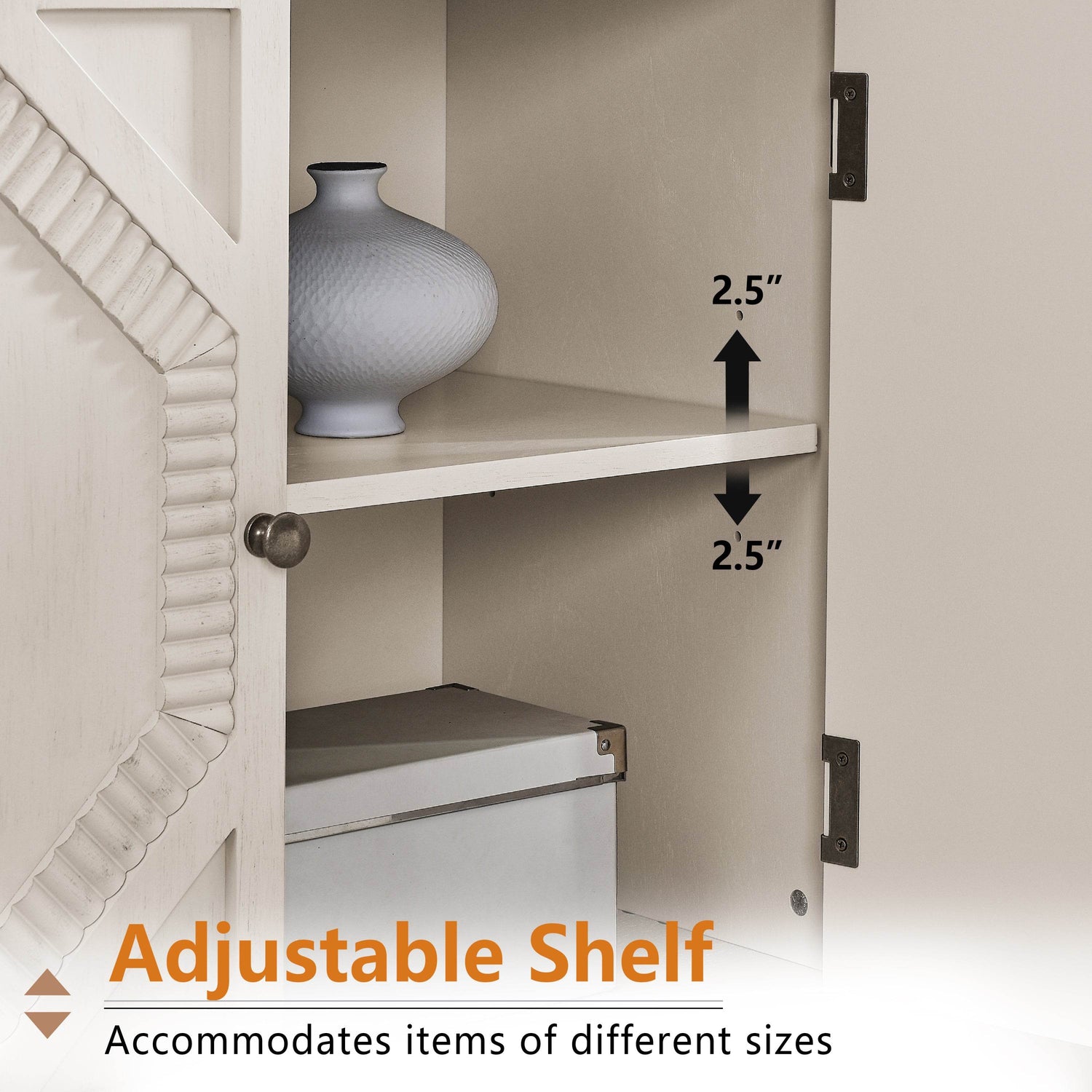 Bring mid-century modern elegance into your home with this 33.6-inch Retro Wooden Sideboard Buffet Cabinet. Featuring a harmonious blend of solid wood and MDF, its antique white finish and symmetrical geometric accents create a timeless aesthetic that complements any living room, entryway, dining room, or kitchen. With spacious storage compartments and an adjustable shelf, this media console credenza keeps your essentials organized and within easy reach. The sturdy solid wood legs ensure lasting durability, while adjustable feet protect your floors and maintain balance on uneven surfaces. Whether used as a TV cabinet, wine cabinet, or decorative storage piece, its fluted diamond pattern and brass handles add a refined touch. Easy to assemble and maintain, this sideboard effortlessly upgrades your space. Enhance your home organization and style today.