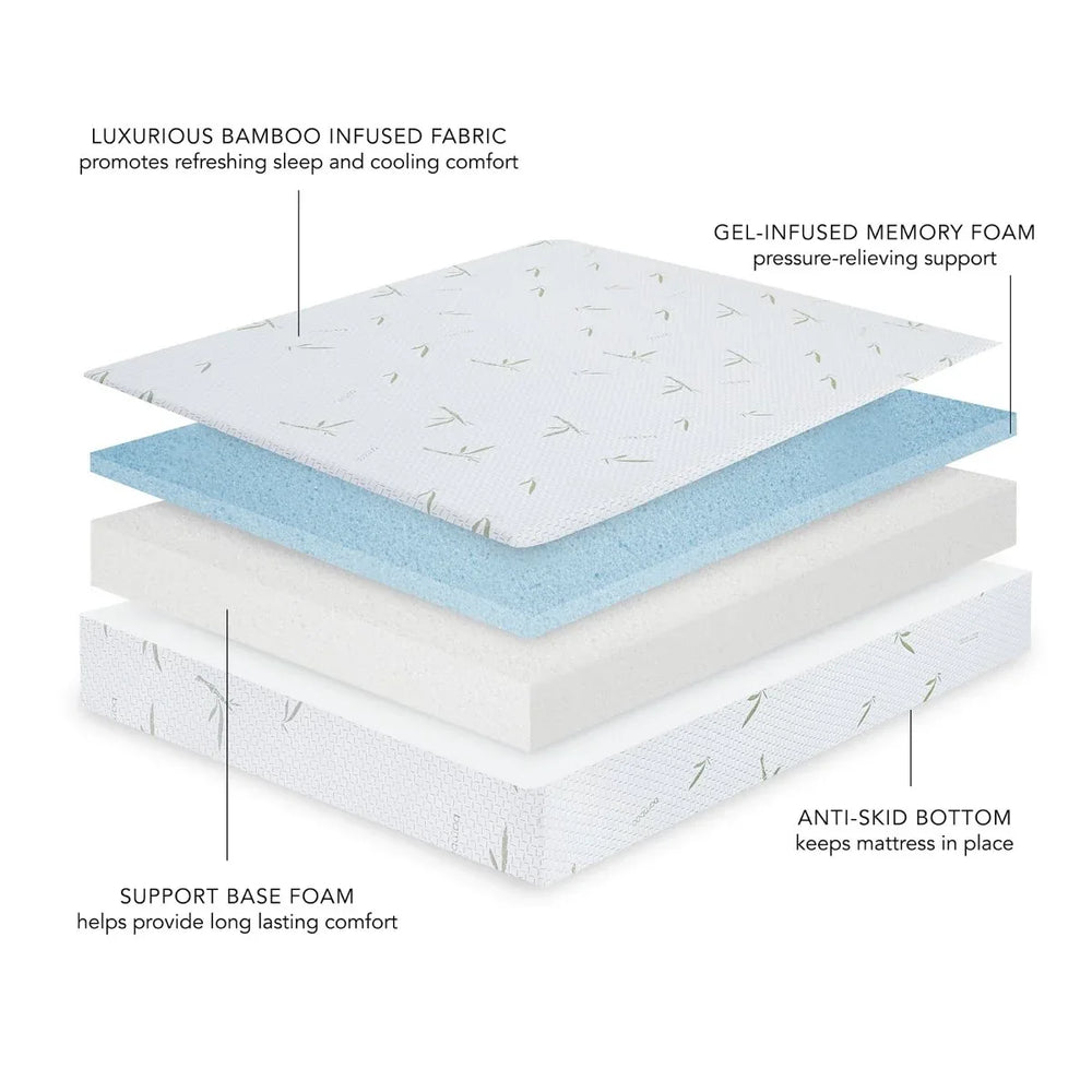 Upgrade your sleep with this premium 8-inch mattress featuring a dual-layer memory foam design and a breathable bamboo infused cover. The gel-infused AeroFusion top layer gently contours to your body, relieving pressure points and supporting proper spinal alignment for a restful night. Beneath, the durable Flex Support Foam base layer ensures lasting stability and prevents sagging. The hypoallergenic bamboo cover enhances breathability, wicks away moisture, and resists dust mites, making it ideal for a cooler, cleaner sleep environment. Conveniently shipped compressed in a box, setup is simple: unpack, unroll, and allow 48 hours to fully expand for optimal comfort. Certified for durability and low emissions, this mattress provides long-term support and relaxation. Elevate your sleep experience today.