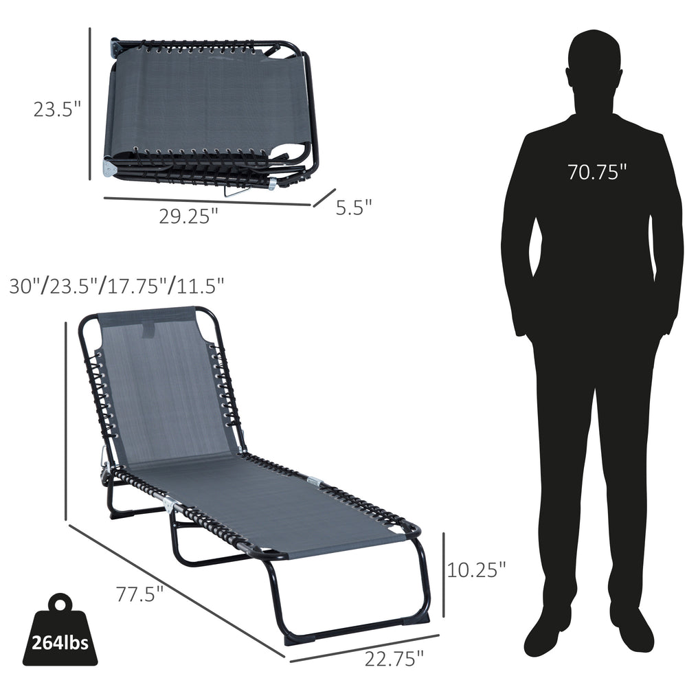 Experience outdoor comfort like never before with this foldable chaise lounge, perfect for patios, poolside, beach trips, and backyard relaxation. Featuring a breathable mesh seat that keeps you cool and dry, this lounge chair offers four adjustable reclining positions to customize your comfort whether sunbathing, tanning, or napping. Its durable steel frame with a water-safe powder finish ensures stability and weather resistance, while its lightweight design and foldability make it easy to transport and store. At 77.5 inches long and 22.75 inches wide, it accommodates most users comfortably, with a strong weight capacity of 264 lbs. Ready to use right out of the box, this pool chair blends convenience and style for your outdoor leisure. Elevate your relaxation experience today.