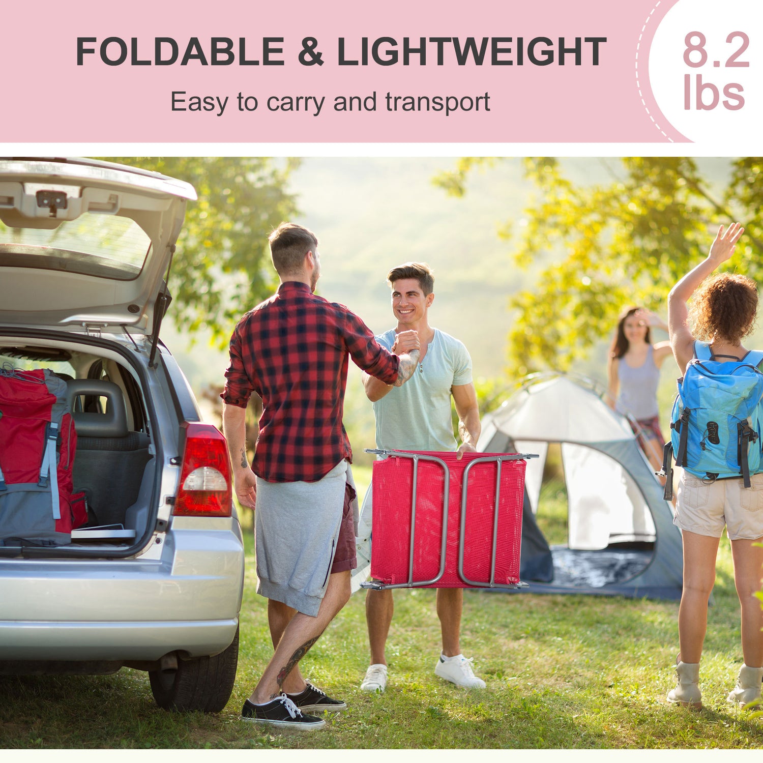 Unwind under the sun with this breathable, pink outdoor chaise lounge chair designed for ultimate comfort and versatility. Featuring an adjustable backrest with five reclining positions, it lets you find the perfect angle for sunbathing, reading, or napping by the pool, beach, or patio. Crafted with a sturdy steel frame and a breathable mesh seat, this lightweight lounge chair stays cool and dry even on the hottest days. Its foldable design makes it easy to transport and store, making it ideal for camping trips or outdoor gatherings. At just 7.7 pounds, it combines portability and durability effortlessly. Elevate your outdoor relaxation today with this stylish and practical lounge chair.