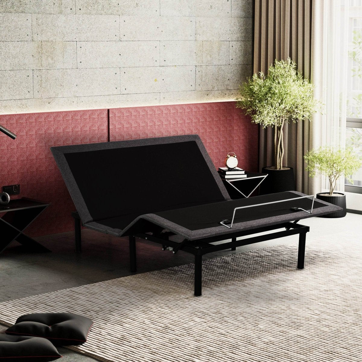 Adjustable Bed Base features wired control and quiet motors for seamless head and foot positioning, supporting up to 750 lbs. Its black metal frame with headboard brackets offers customizable bedroom comfort, ideal for enhancing sleep and relaxation.