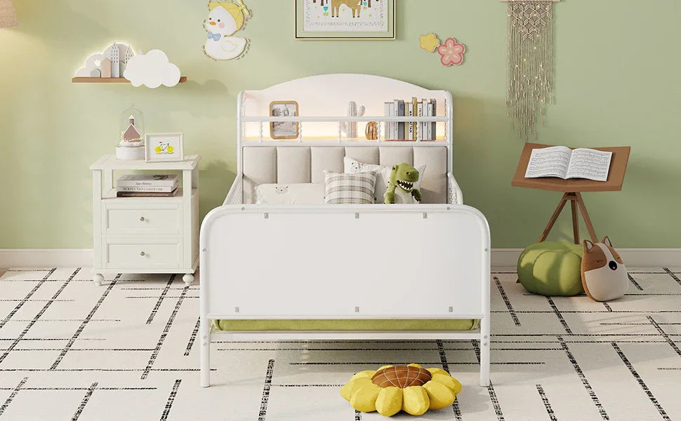 Twin kids metal platform bed frame features a velvet upholstered headboard with storage shelf, integrated LED light strips with customizable colors, all-round safety guardrails, and a durable powder-coated frame with 21 slats for strong support and secure, stylish sleep.